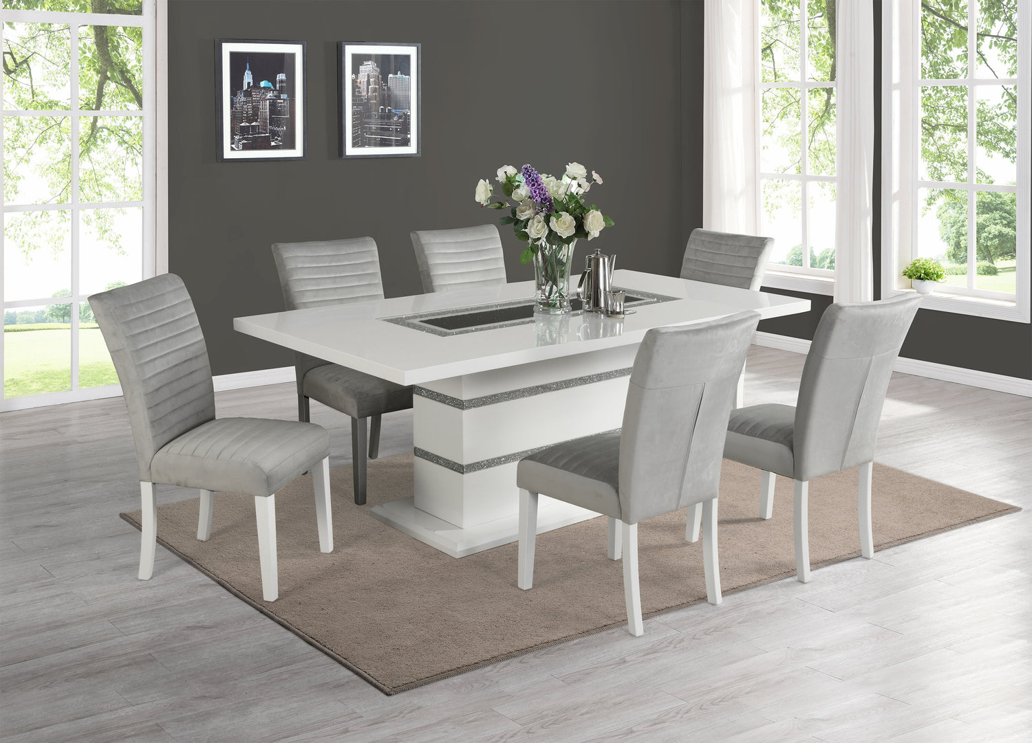 Dazzle your dinner guests with the sparkle of this seven-piece Garbo dining package. Bands of sparkling silver wrap around the glossy white base for a subtle yet glitzy look to this piece. A glass insert protects the glittering black and silver beads sitting in the centre to charm your company. Soothing velvet has a light grey tone for a luxurious look that won't outshine your dining room decor. Padding the chairs are thick layers of high-density foam, sewn into horizontal channels to emphasize plushness. Let style and elegance join you for a meal at this Garbo dining set.