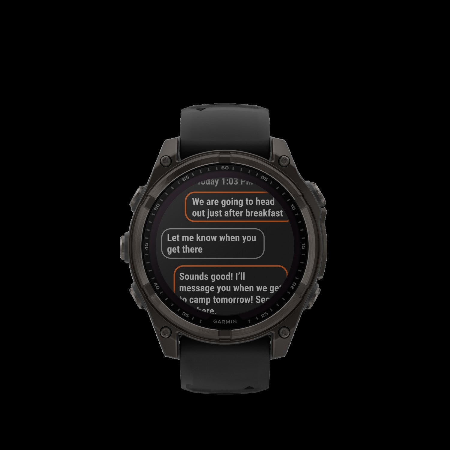 The fēnix® 8 multisport gps smartwatch is built for serious athletes and outdoor adventurers who want to push beyond their limits. It features a 1. 3” solar charged display with scratch-resistant sapphire lens, durable titanium bezel and powerful built-in led flashlight for after-dark visibility. A built-in speaker and mic enable you to make and take calls from your wrist when your watch is paired to your smartphone. Power up your body’s performance, endurance and resistance to injury with targeted strength training plans and a full range of sport-specific workouts. Performance insights help manage your exertion and build stamina, while training readiness features show how much recovery time you need between workouts, based on 24/7 health and wellness monitoring of heart rate, respiration, stress, sleep and more (data presented is intended to be a close estimation of metrics tracked). Take to the trails with built-in abc sensors and preloaded topoactive maps. The dynamic round-trip routing feature helps simplify the planning of your runs or rides — letting you set your target distance and receive turn-by-turn directions that adjust to get you back to your start on schedule. Enjoy extended off-grid adventures with solar power providing up to 92 hours of battery life in gps mode (assumes continuous use for entire period in 50,000 lux conditions). Plus, a 40-meter dive rating and leakproof metal buttons let you reach new depths of adventure. Additional features include music storage, garmin pay™ contactless payments (with a supported country and payment network), smart notifications (compatible smartphone required) and more.