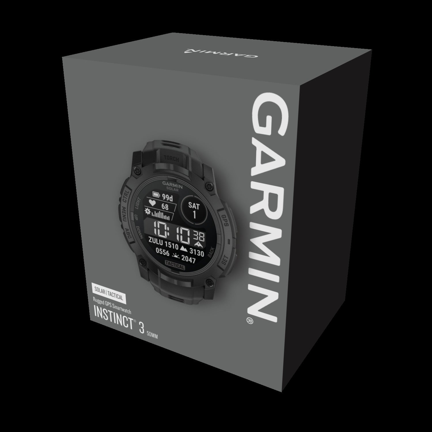 | Key Features | Instinct® 3 50mm - Solar GPS: Solar charging, 50mm case, GPS navigation, heart rate, rugged design, multi-sport modes |