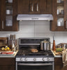 Clear the kitchen air in style with this 30-inch under-the-cabinet range hood from Profile. Chef Connect lets you sync this hood with your compatible GE range so when you begin using the cooktop, your hood’s fan and lights automatically switch on. Eliminate odours, steam and grease with four powerful fan speeds and a 390-CFM motor, then simply clean the filters in the dishwasher. Sleek from every angle, this range hood features glass touch controls that are as easy to use as they are to clean.