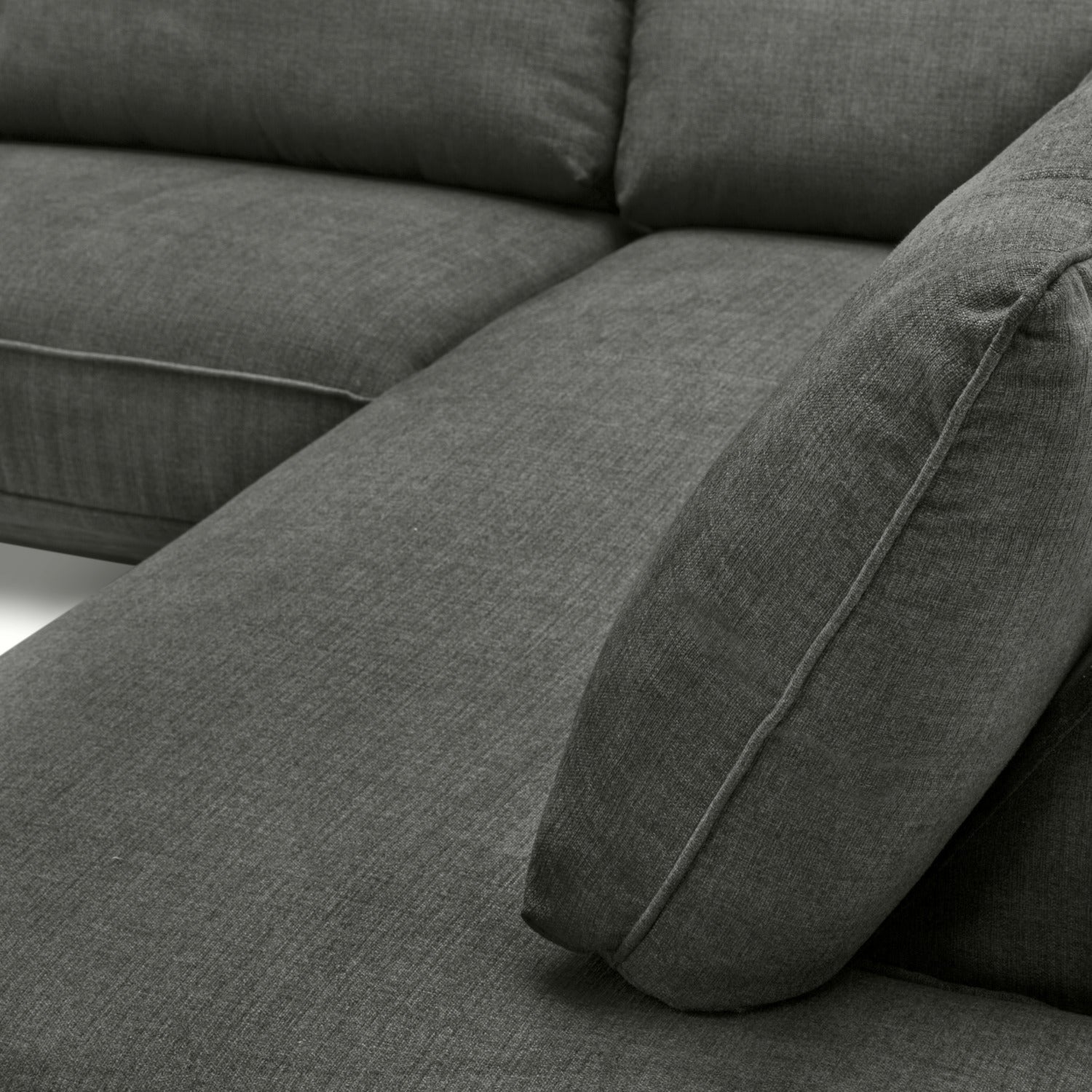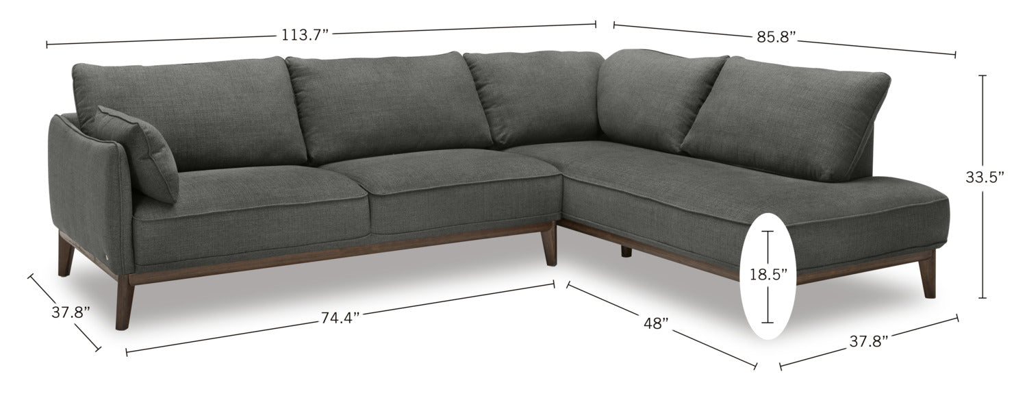 Part of the Cindy Crawford Home collection, make a stylish impact on your living space with this Gena two-piece, right-facing sectional. Swathed in soft, linen-look fabric, this grey upholstery offers elegance and charm in one package. You'll have no problem offering friends a seat on the sectional's high-density cushions, which are wrapped in fibre batting for an extra touch of comfort. Resting on a brown-hued solid wood base, this sofa sectional gives your home a sophisticated feel and a cozy resting place all in one.