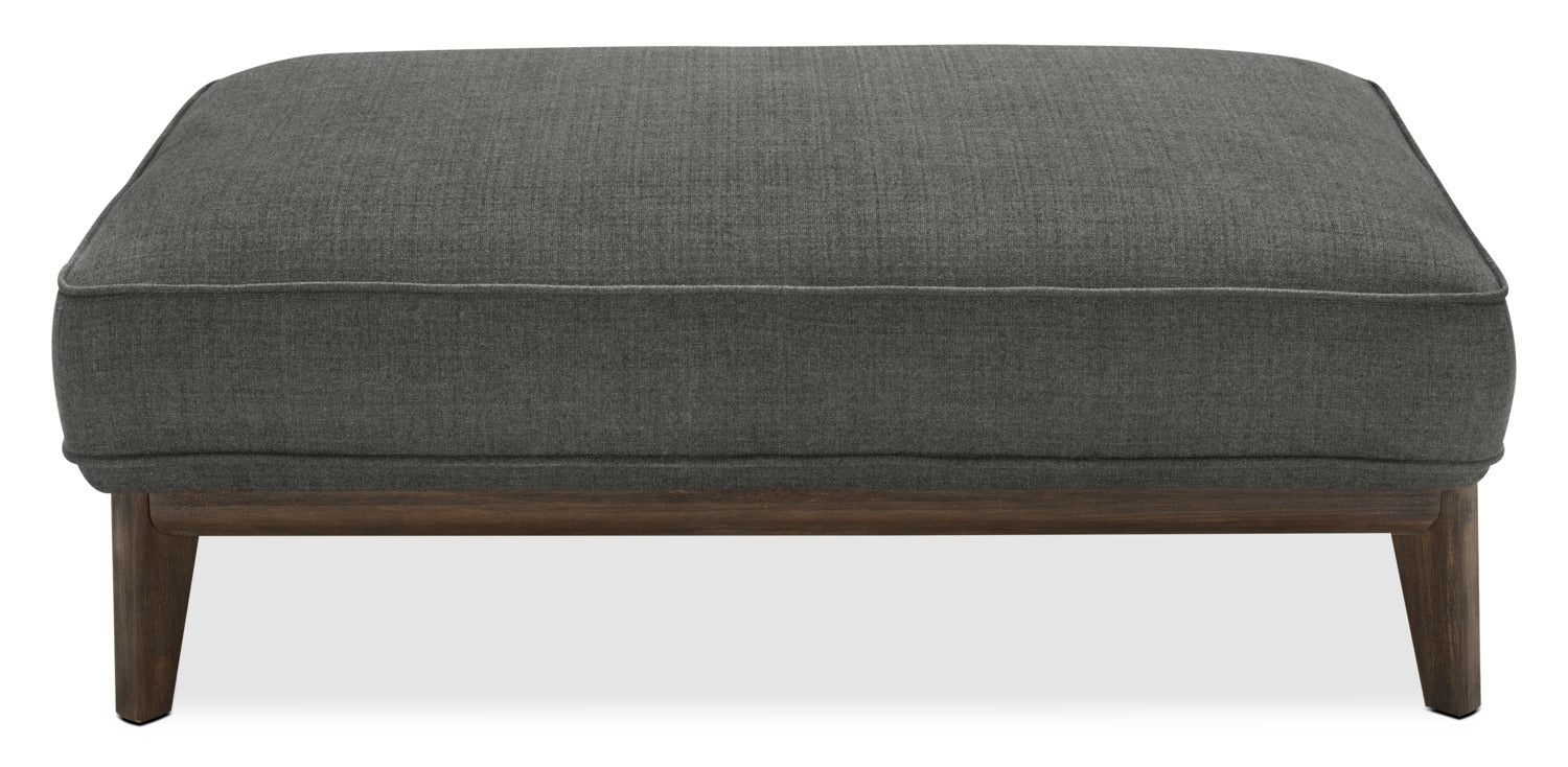 - Solid, brown-finished wood frames the ottoman's base for an elegant touch.