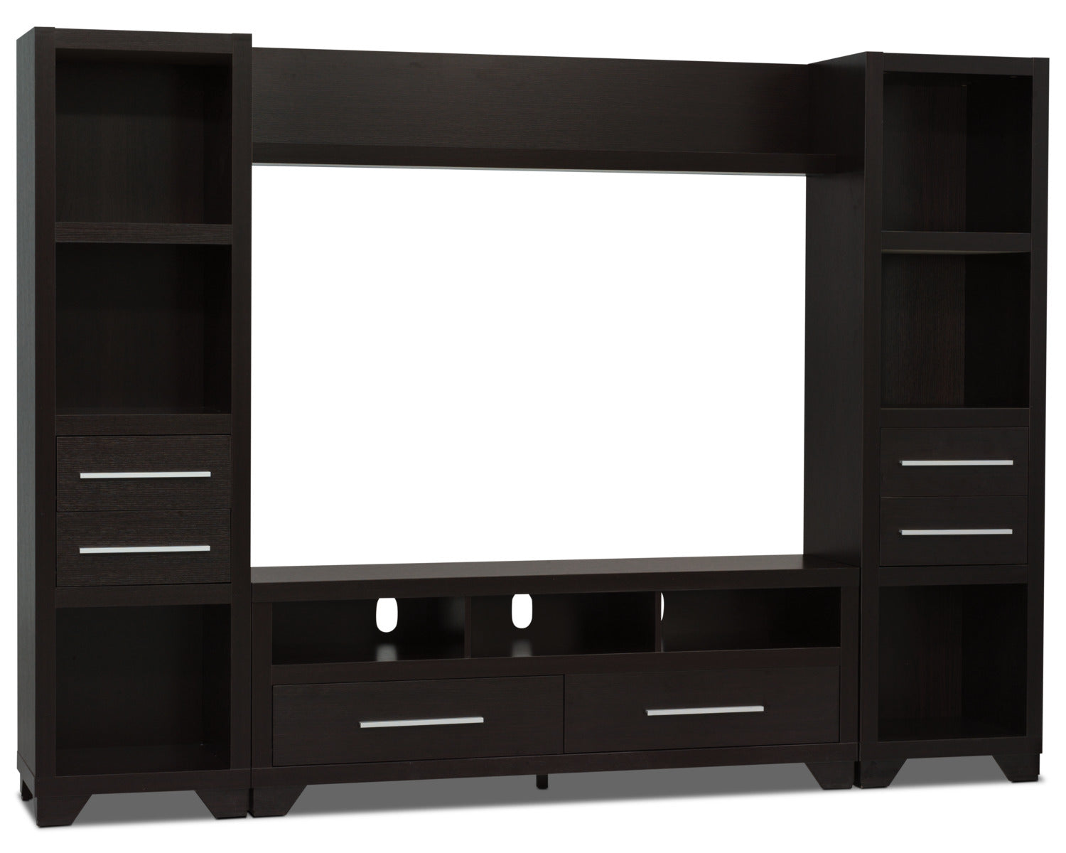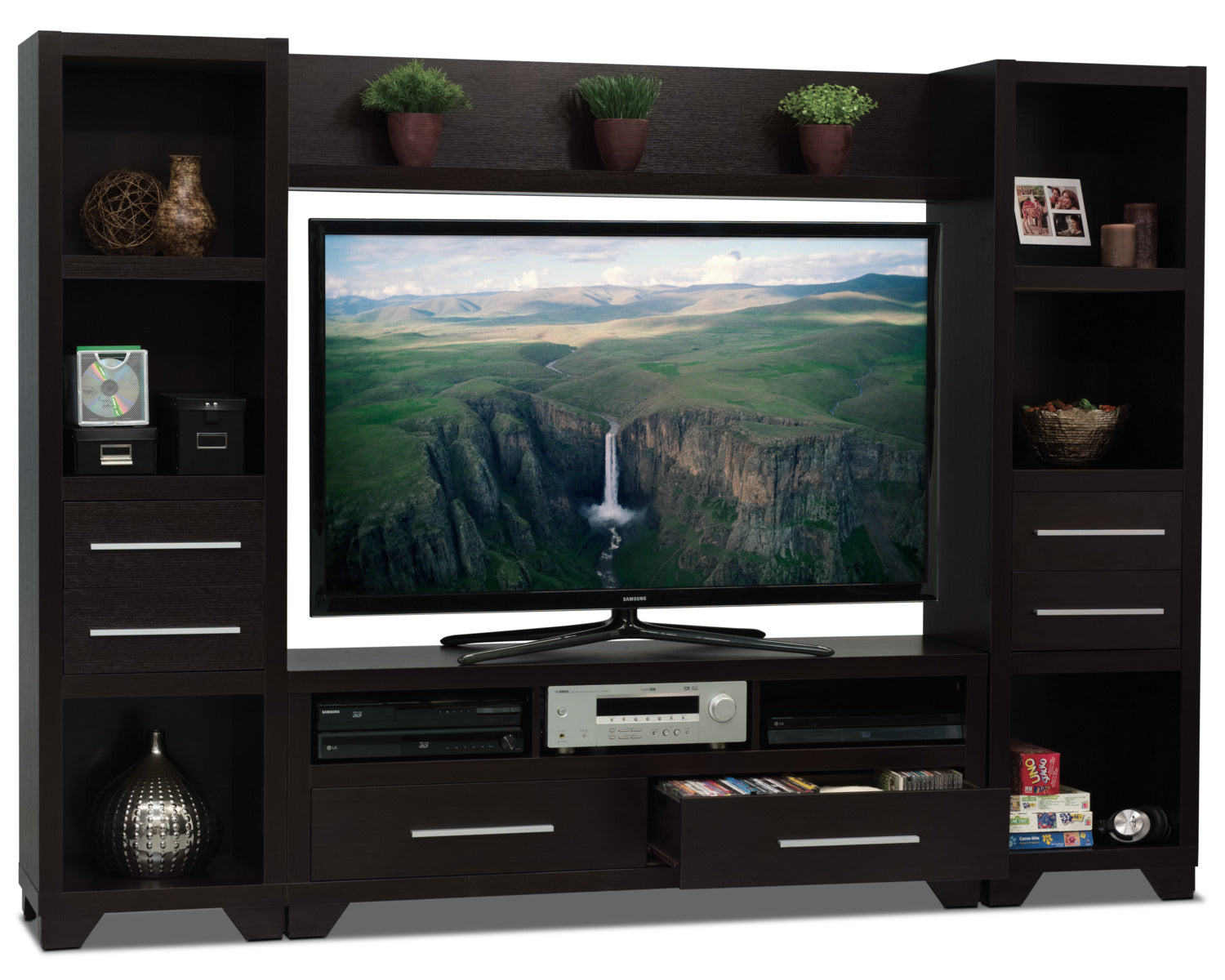 Create the perfect media room with this Glendale four-piece entertainment centre. For televisions up to 60 inches, this stand can hold your big-screen TV – perfect for family movie nights. Drawers let you organize small items, like remotes, game controllers and extra batteries, while open shelves provide a place for your cable box, game console and even decor. Plus, the espresso finish is warm and sophisticated.
