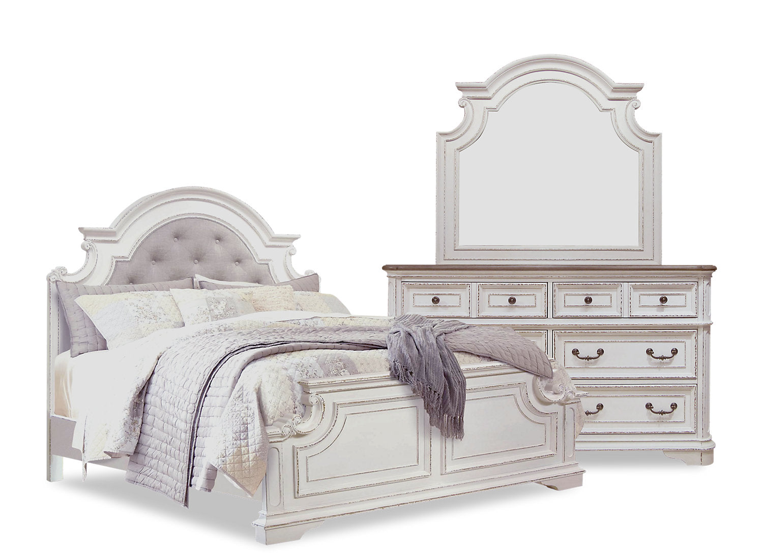 Embrace the feeling of having a secret, countryside retreat in your own home with this stunning Grace bedroom package. The antique white headboard and footboard of the king bed feature gently sloping curves for a farmhouse charm. Accented by antiqued brass handles and brushed oak tops with a distinct rounded-butterfly design, this collection will help make your bedroom into the relaxing cottage of your dreams.