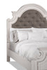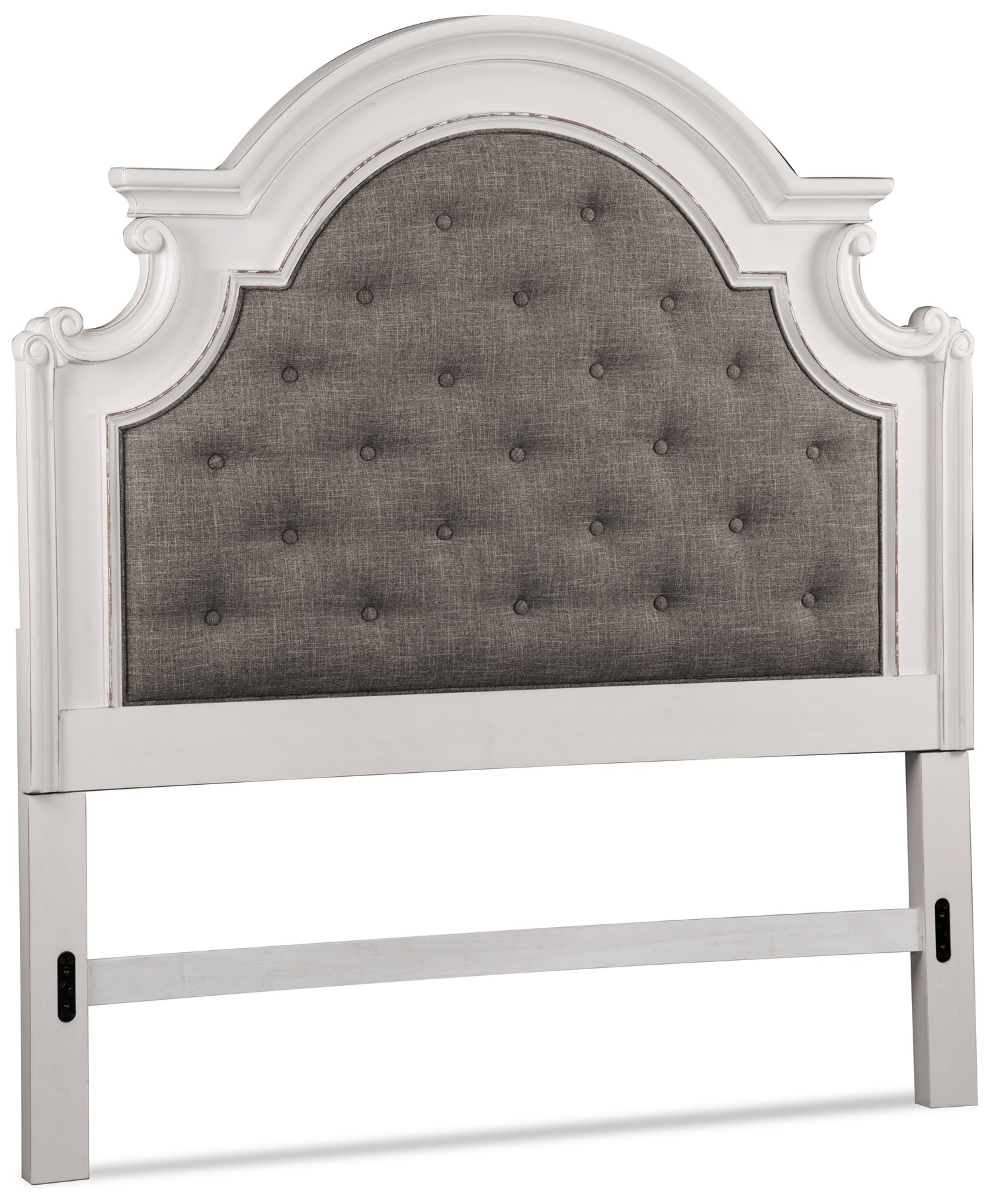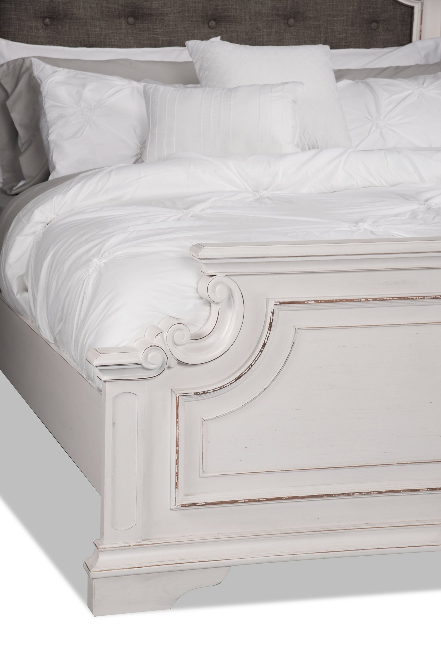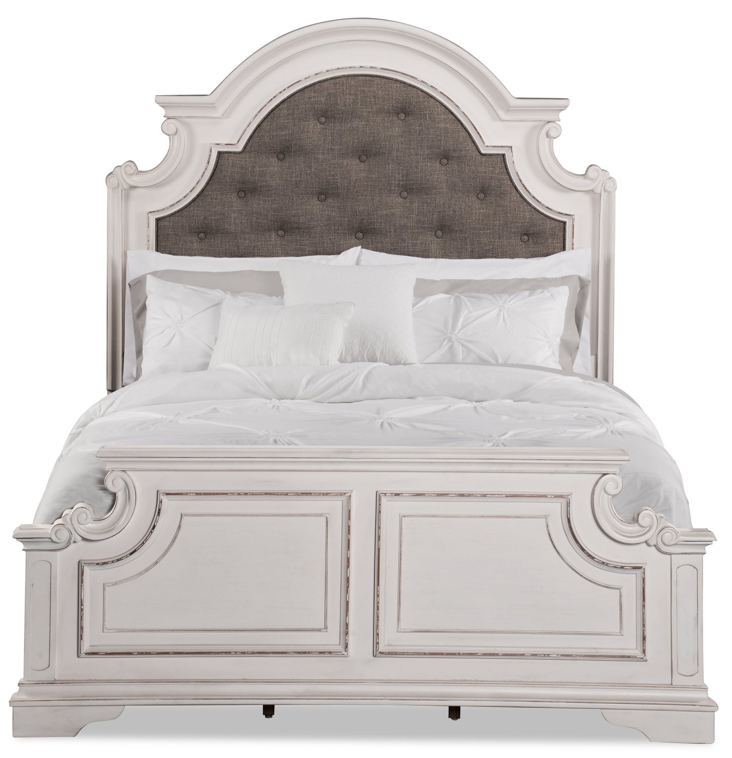 Embrace the feeling of having a secret, countryside retreat in your own home with this stunning Grace queen bed. The antique white headboard and footboard feature gently sloping curves for a farmhouse charm. Light grey polyester on the headboard provides a soft, homey resting spot for your head. Adjustable support legs under the bed slats ensure this bed will remain a strong support for you no matter what. With wide wooden feet carrying you into slumber, this bed will help make your bedroom into the relaxing cottage of your dreams.