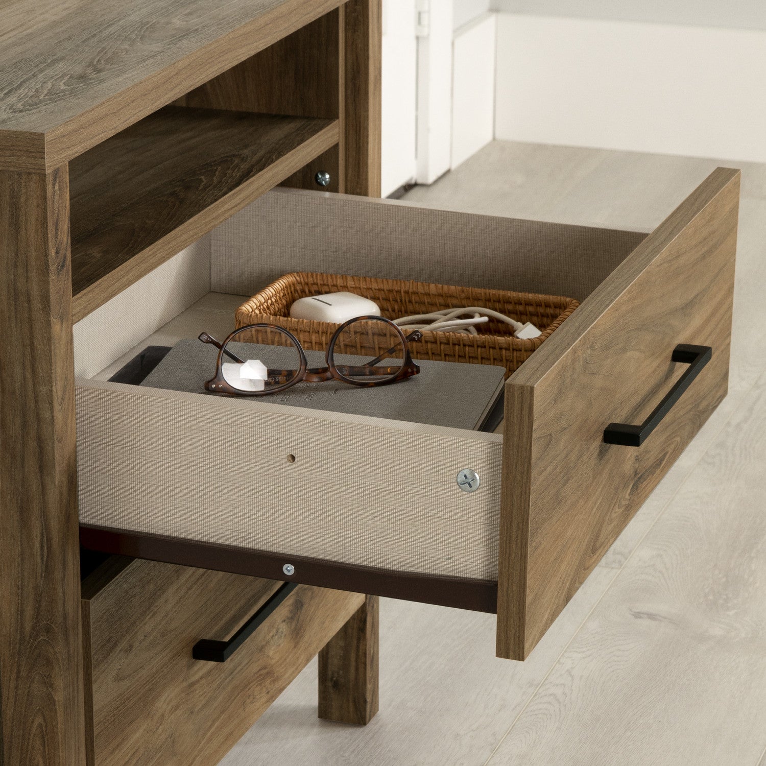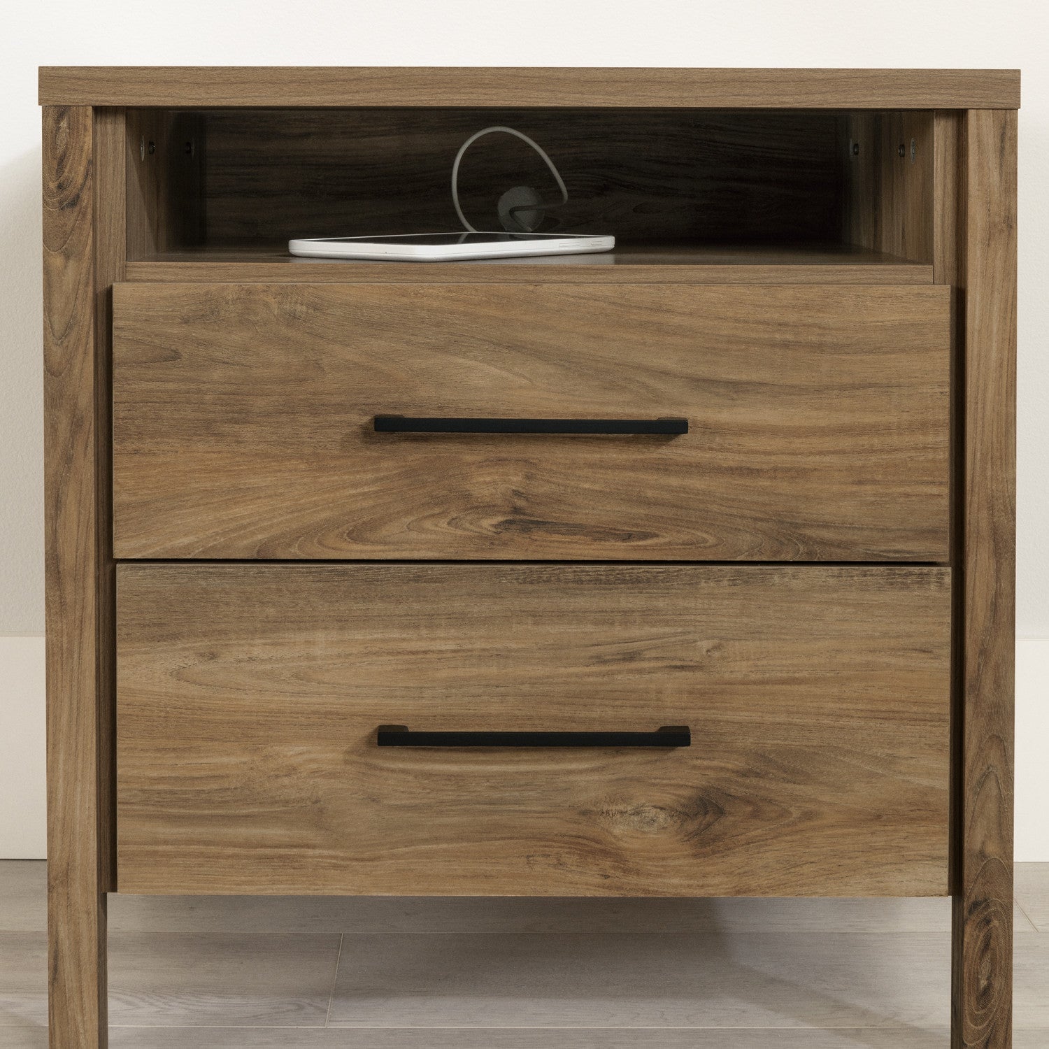 A more than useful nightstand. This nightstand will be a real beauty in your bedroom! The two large drawers provide storage for all the items you don’t have room for in your wardrobe, like your underwear or socks. The open space can hold everything you need to have close at hand, like a book for your nighttime reading. And the surface is great for holding everything you use regularly, so it’s close to you: your cell phone, an alarm clock, a lamp to adjust the lighting in your room, etc. A contemporary bedside table, this contemporary piece can fit into all types of decor! Two things set it apart: the slim minimalist handles and square legs, which give it a very trendy clean style. Pair it with other furniture from our gravity collection, for a full set.