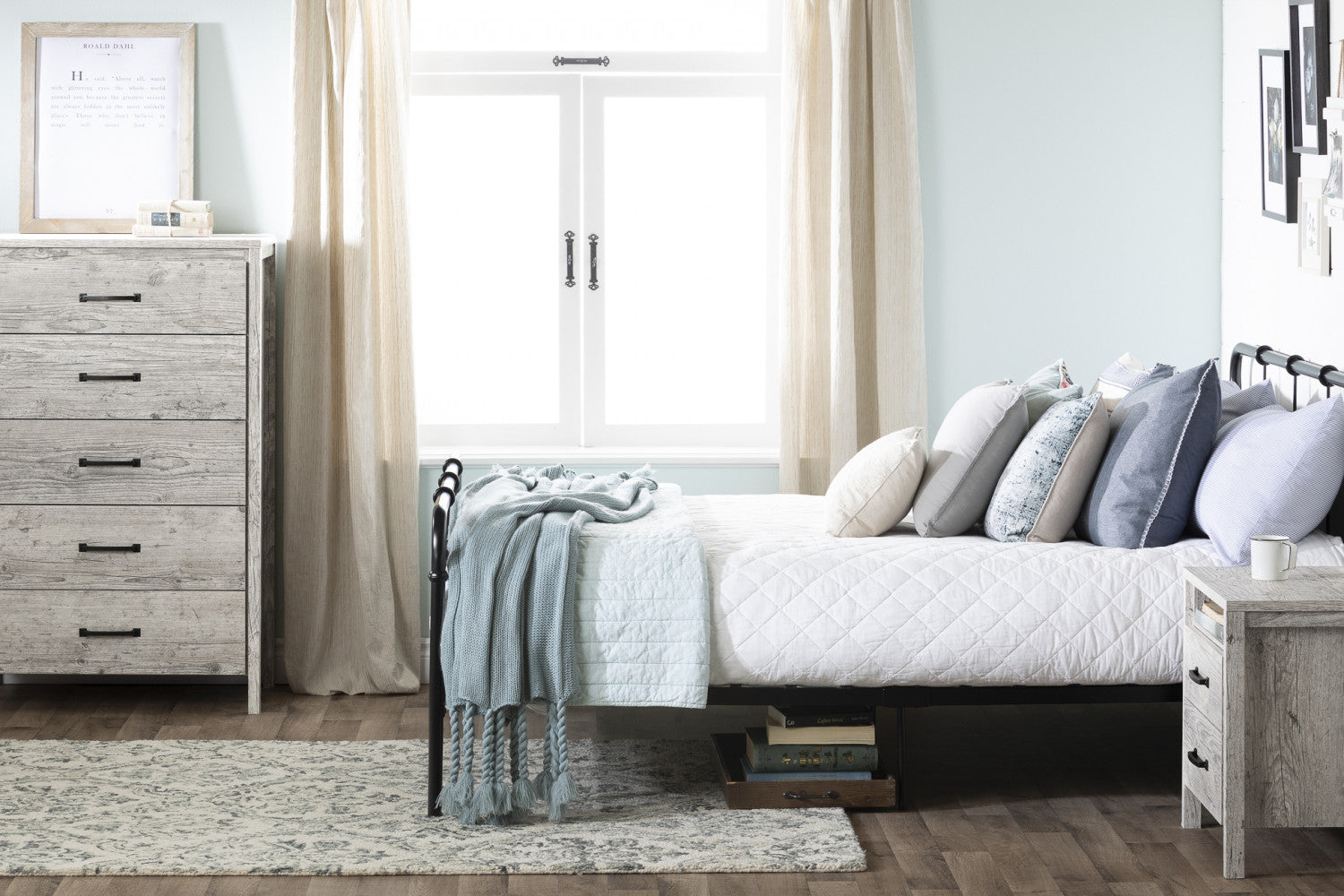 A more than useful nightstand. This nightstand will be a real beauty in your bedroom! The two large drawers provide storage for all the items you don’t have room for in your wardrobe, like your underwear or socks. The open space can hold everything you need to have close at hand, like a book for your nighttime reading. And the surface is great for holding everything you use regularly, so it’s close to you: your cell phone, an alarm clock, a lamp to adjust the lighting in your room, etc. A contemporary bedside table this contemporary piece can fit into all types of decor! Two things set it apart: the slim minimalist handles and square legs, which give it a very trendy clean style. Pair it with other furniture from our gravity collection, for a full set.