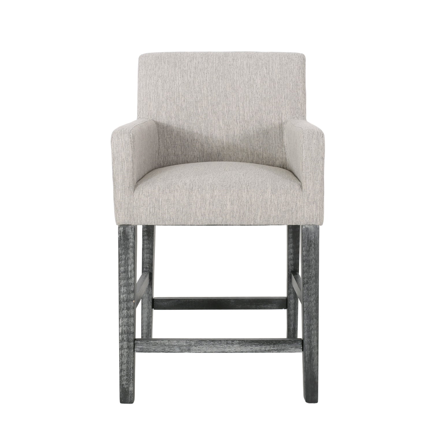 The counter stools combine comfort, durability, and modern charm in a set of two. Upholstered in light gray fabric with rounded armrests, these stools offer a cozy and refined seating experience. The sturdy rubberwood frame features a natural grain finish and a supportive h-frame base. At 26" seat height, they fit most kitchen counters and islands with ease. Perfect for casual meals or entertaining, the mason stools are designed for lasting comfort and visual appeal. Easy assembly with tools and instructions included.