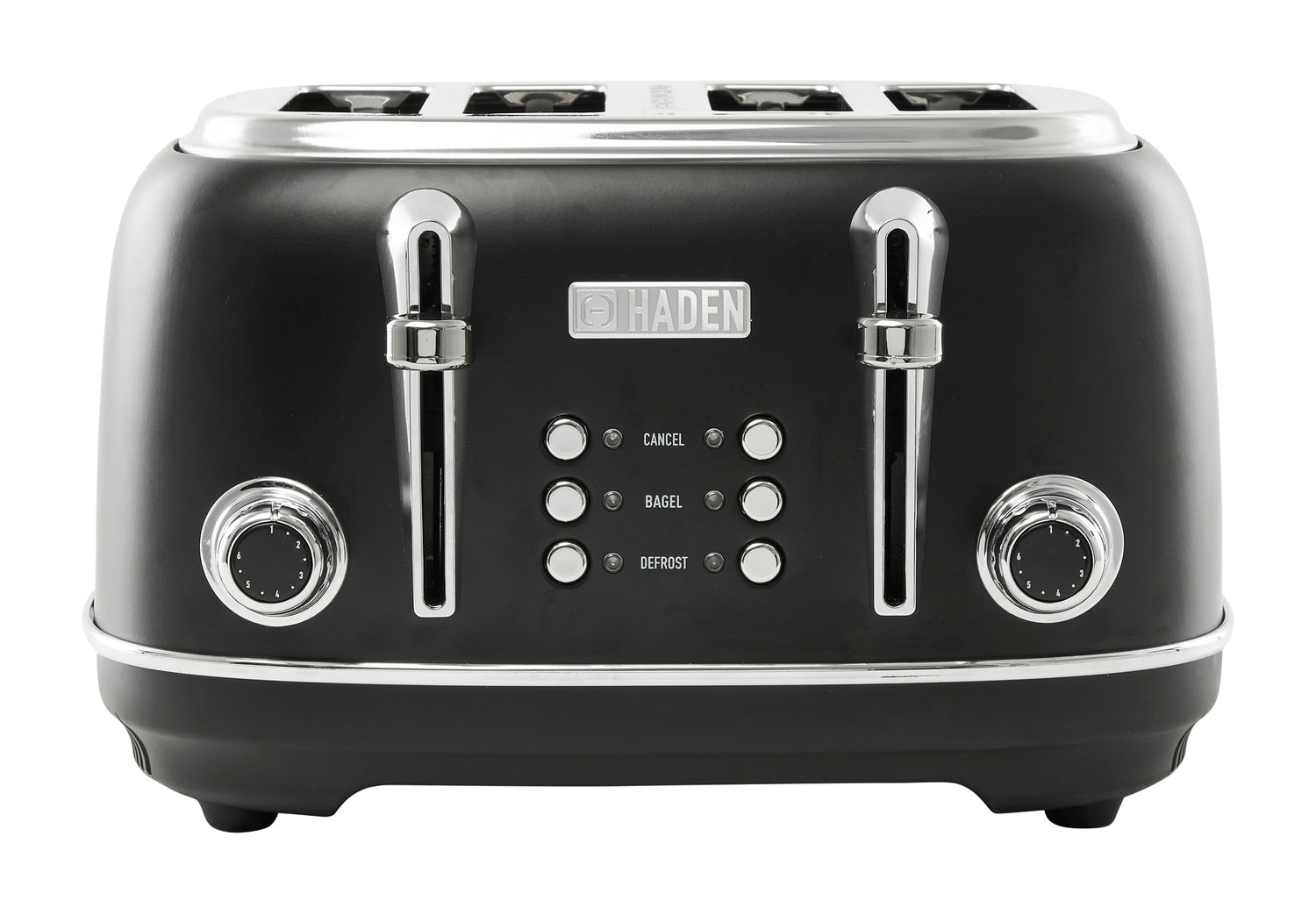 This classic HADEN Heritage 4-Slice toaster features convenient cancel/defrost/bagel button settings, a self-centering function and a removable crumb tray for easy cleaning. The browning control dial allows you to select the perfect timing for your bread, English muffin or waffle. Its beautiful design and retro hue are sure to brighten up your day.