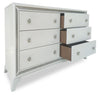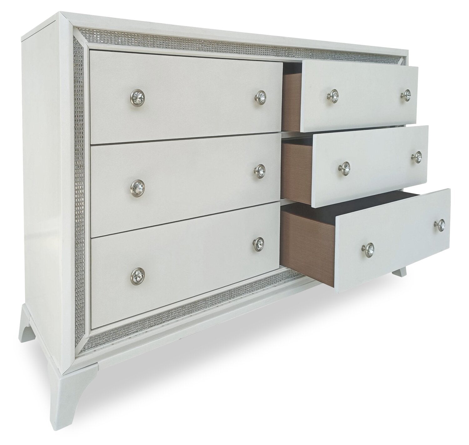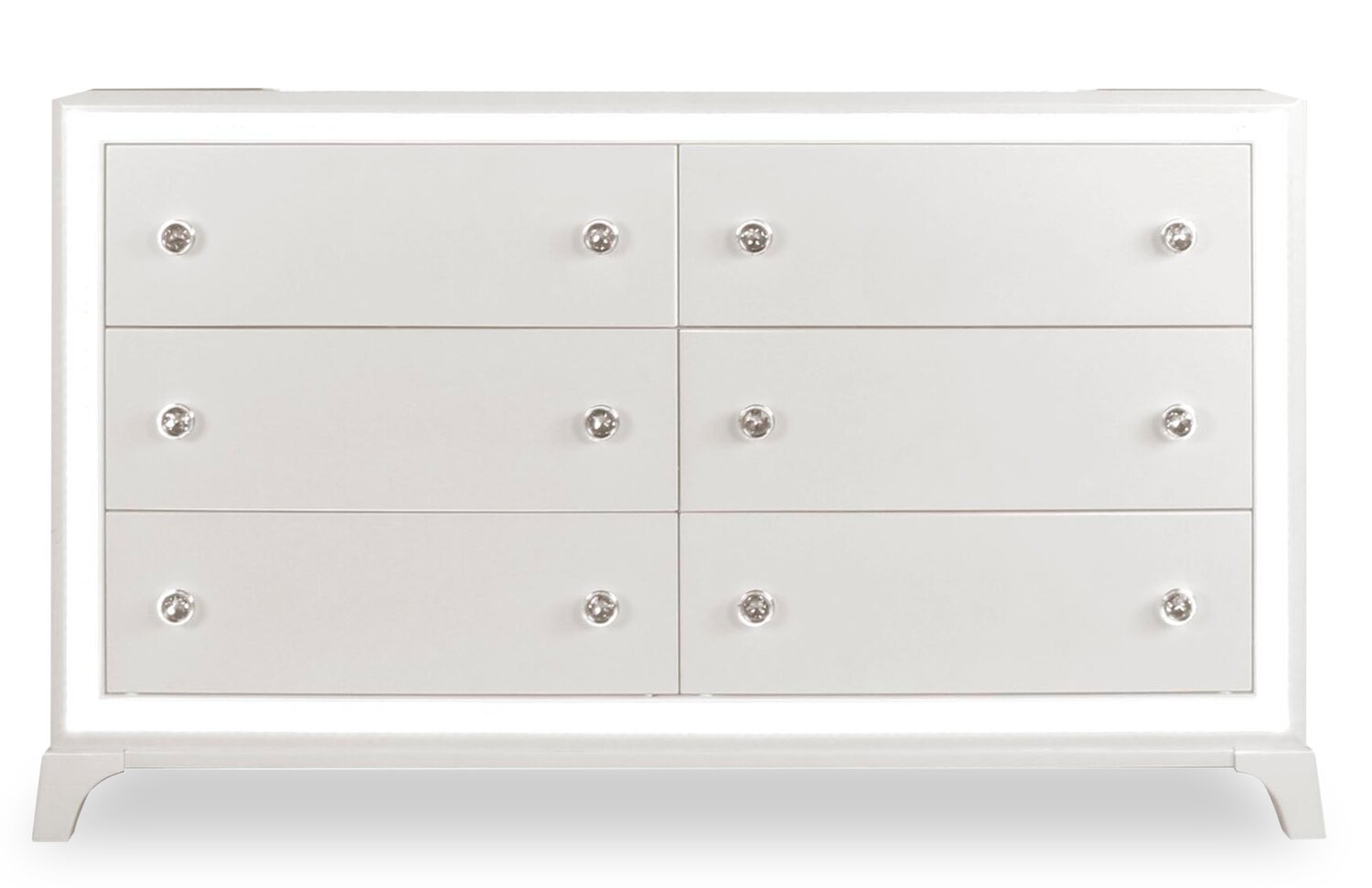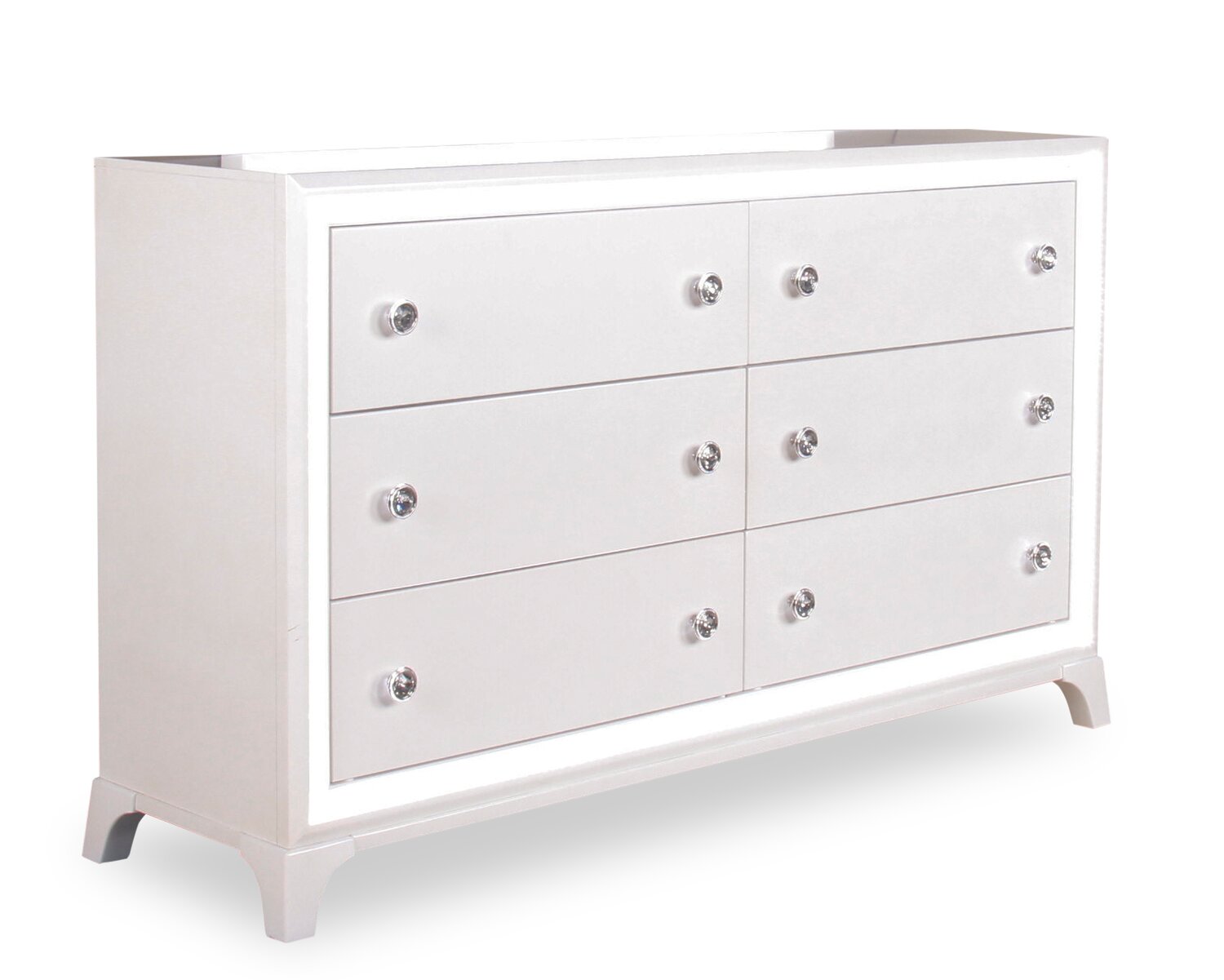 | Accent Details | Crystal knobs stand out against the white finish. |