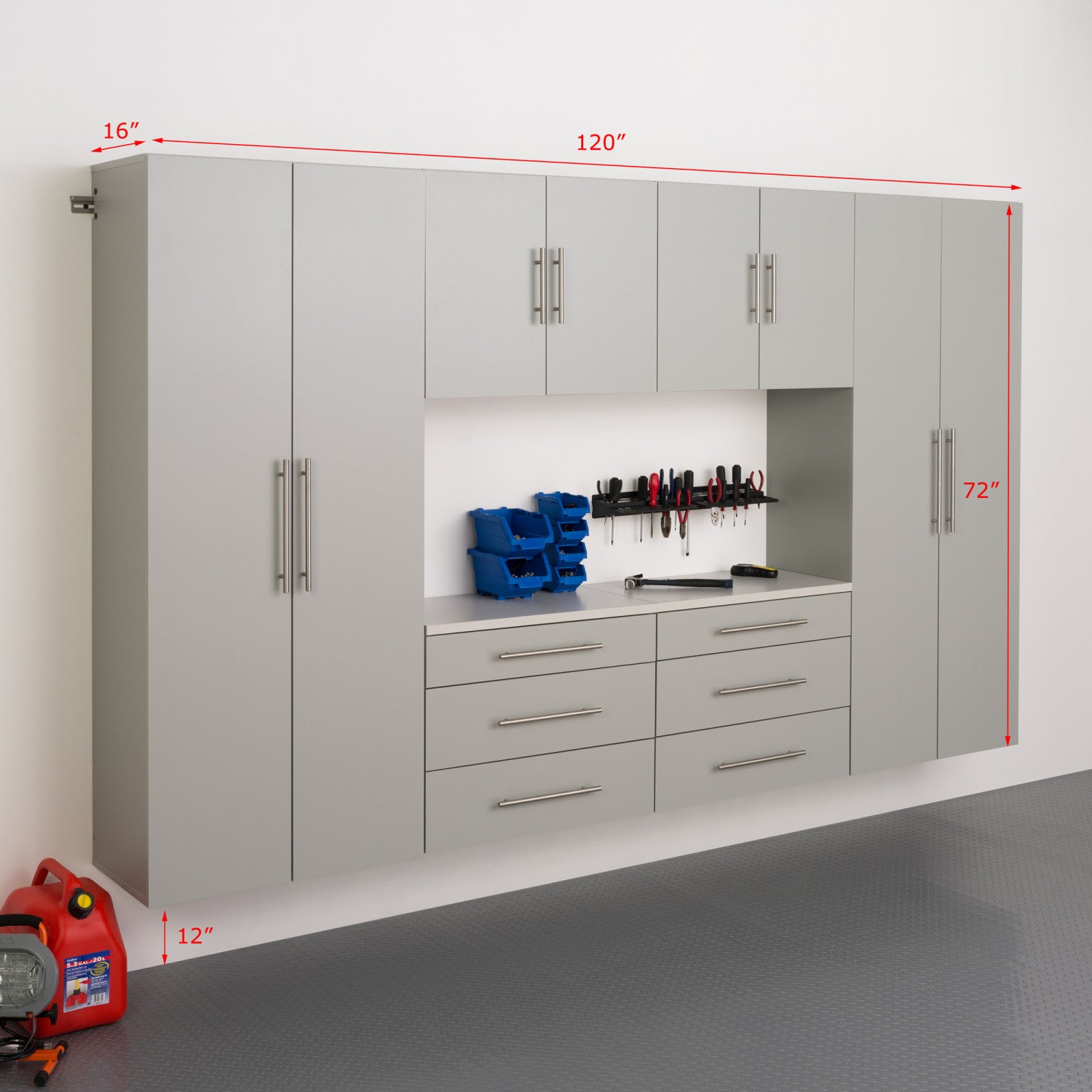 The hang-ups storage cabinet collection offers versatility for your ever changing storage needs in the garage, laundry room, office or workshop. The cabinets mount securely to the wall with a heavy duty metal rail and hook system. The wall mounted feature ensures easy cleaning beneath the cabinets and protects your stored items from water & dirt. The hang-ups collection is constructed using laminated composite wood and features metal handles and adjustable hinges. This product ships ready-to-assemble and includes all hanging rails and fastening bolts. Add other cabinets from our hangups collection to create a storage system to convert any cluttered room into an organized space. Set i includes: (qty 2) 30” large storage cabinet model # gscw-0707-2k 30"w x 72"h x 16"d 3 adjustable shelves and 1 fixed shelf with middle divider (shelves are. 75" thick) weight capacity: 200lbs (40lbs per shelf) (qty 2) drawer base cabinet model # gscw-0730-1 30"w x 24"h x 16"d 3 drawers feature metal drawer sides and 1/2 inch drawer bottoms weight capacity: 120lbs (30lbs per drawer/top) (qty 2) 30” upper storage cabinet model #gsuw-0707-1 30"w x 24"h x 16"d 1 adjustable shelf (. 75" thick) weight capacity: 60lbs (30lbs per shelf)