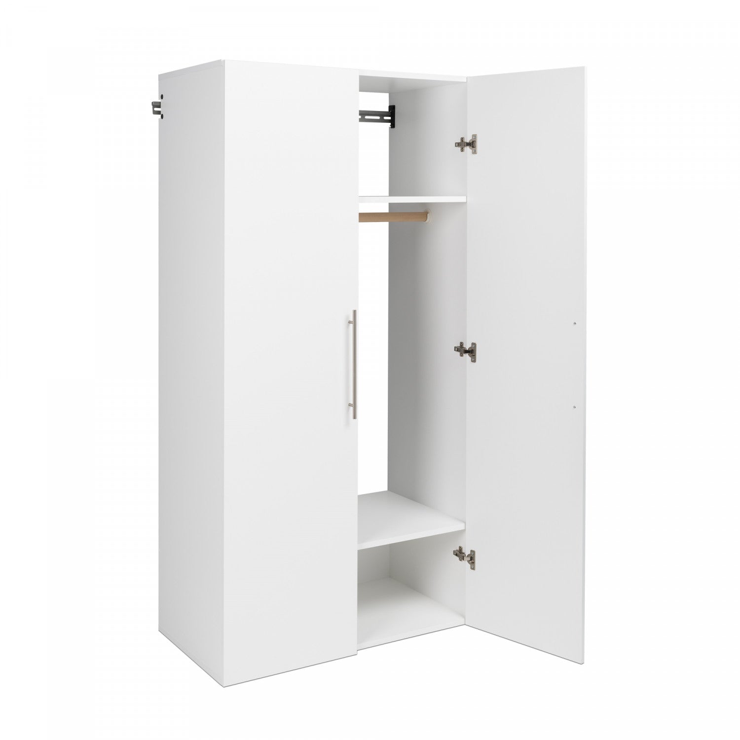 Welcome in a new organizational system with the prepac hang-ups wardrobe cabinet. This wall-mounted storage solution features two sophisticated clean line doors on adjustable hinges, one top fixed shelf with a middle divider, one bottom fixed shelf and an integrated wooden hanging rod for flexibility. In a fresh white laminate finish with two satin nickel-finished metal pull handles, this multipurpose wardrobe cabinet blends right into your home. Use this spacious wardrobe compartment to hang your jackets from the wide rod, and slide your accessories into the fixed shelves. This wardrobe cabinet is the perfect extension to your bedroom closet system, or as a coat closet in your mudroom, entryway, or garage. Designed to be secured into a sturdy wall with the included heavy duty metal rail and hook system, your stowed items will be kept safe from debris while allowing for easy clean-upon the ground or other surfaces underneath. This durable cabinet ships flat packed and ready to be assembled upon delivery with an included instructional booklet, hanging rails and fastening bolts. This unit is made with non-toxic, carb-2 compliant laminated composite woods. Measuring 20"d x 36"w x 72"h, you won't run out of storage space for your clothing.