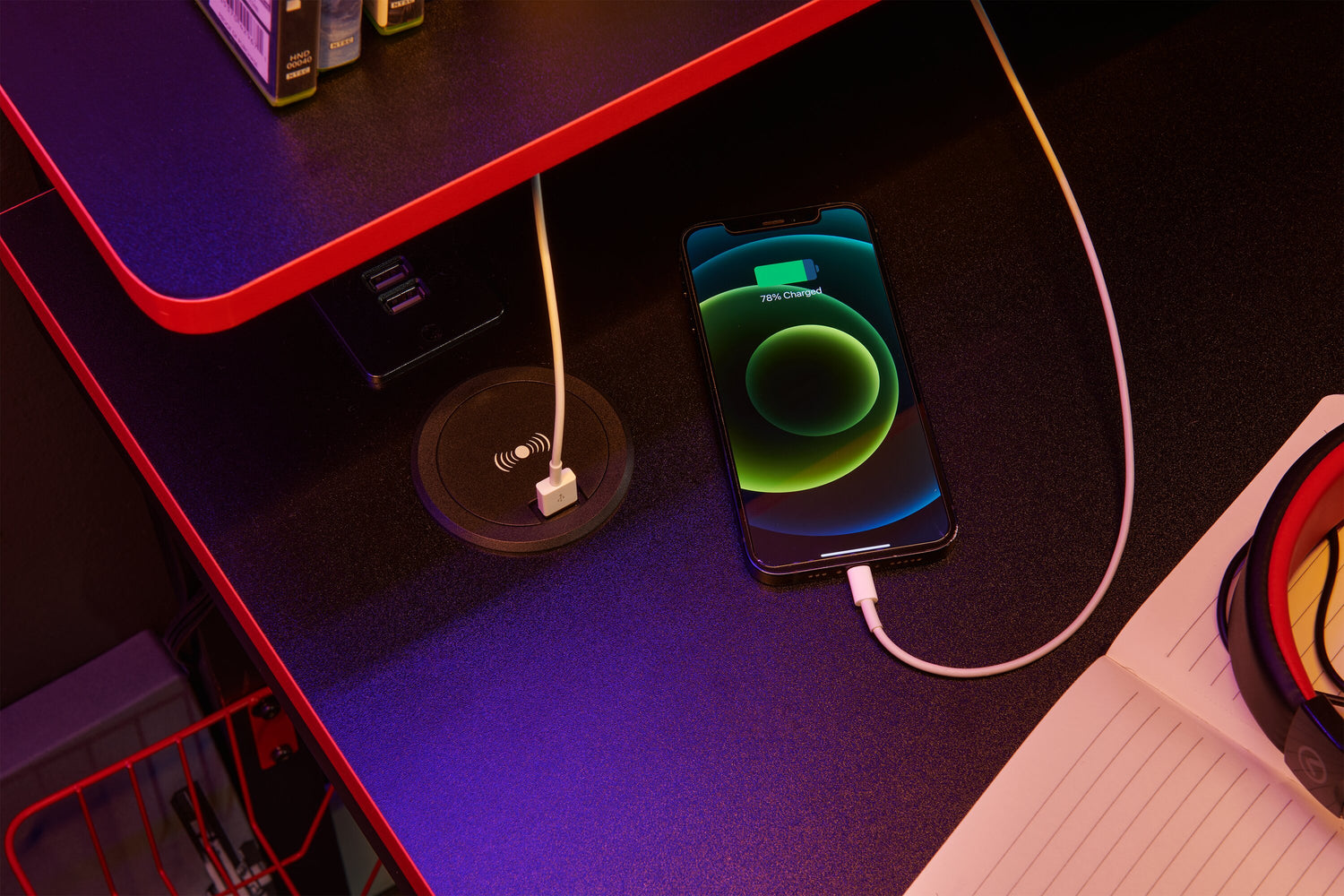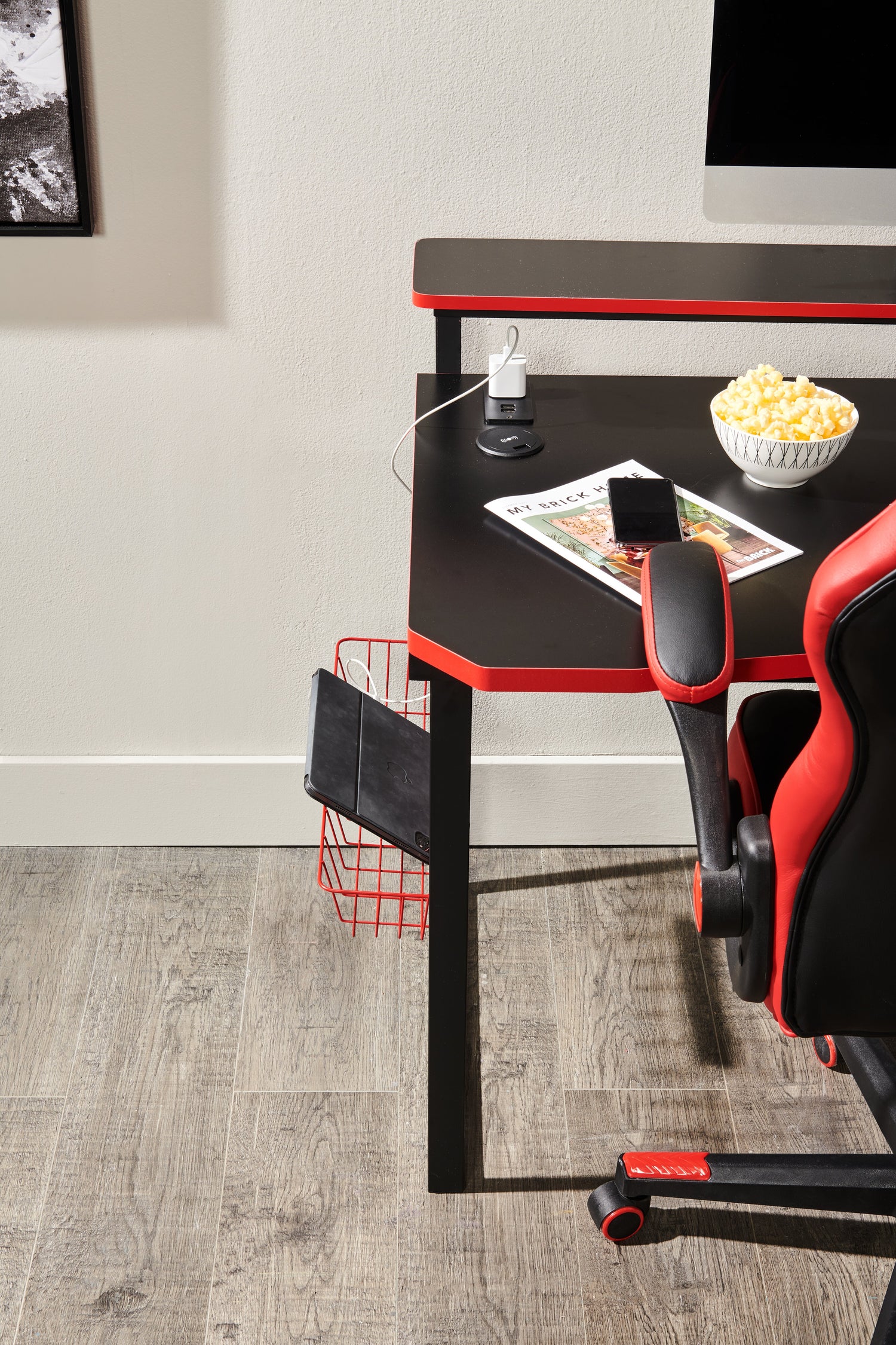 | Accent Details | Dynamic red trim runs along this desk and colours the wire basket, hook and cup holder for a sporty presentation. |