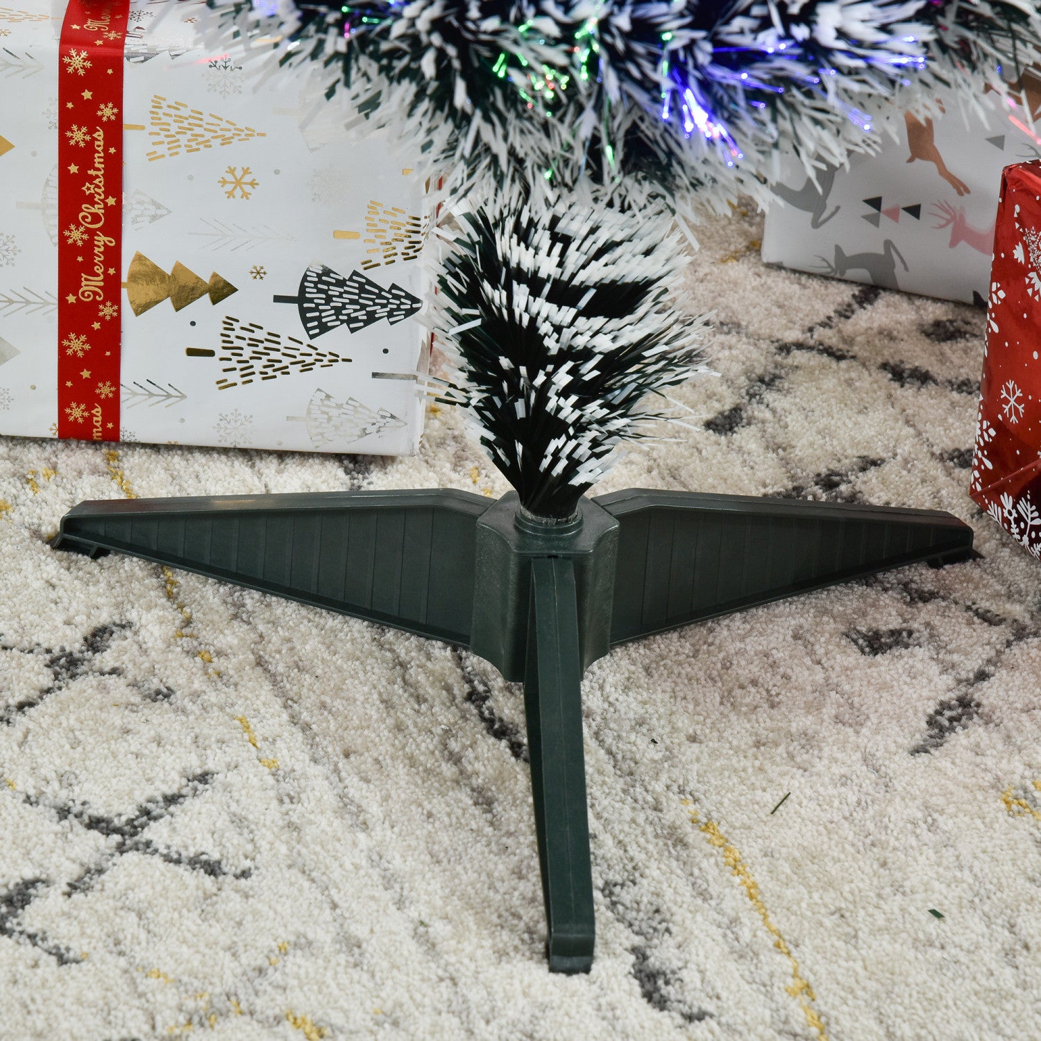 | Key Features | ● Beautiful green artificial Christmas tree with hundreds of tiny scattered snow side ● Made of dense PVC needles with 90 branches to appear natural and full to last all season ● Pre-lit optical fiber lights in 3 color placed all over the tree ● Includes a star topper attached to the tree adding a festival glow to your home ● Multi-color lights that remain lit even if a bulb burns out ● Easy to assemble and disassemble for storage ● Perfect for indoor decoration at Christmas, foil the festival atmosphere ● RECOMMENDED SETUP: For the fullest results, work from top to bottom spreading every branch in a spiral motion |
