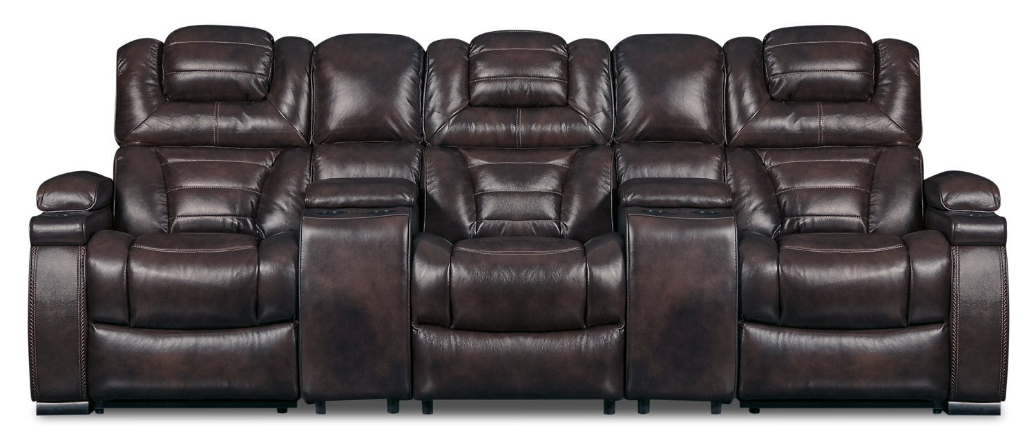 Make your movie-watching space feel luxurious with this Hugo power reclining home theatre sectional. Headrests and cushions are plump thanks to the high-density foam packed into every nook and cranny. As well, the entire seating area is covered in genuine leather for a chic look you'll enjoy. Use the power adjustment buttons in different ways – adjust your seat's angle, tilt your head up or down to see the TV, or do both until you're satisfied. Plus, cupholders and underarm storage areas are ready to hold your tasty theatre treats.