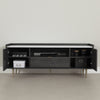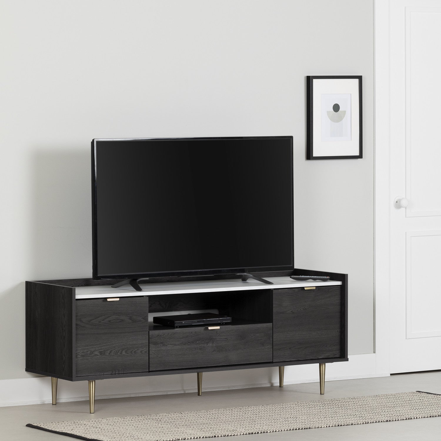 Do you like when your furniture is as beautiful as it is practical? This glam TV stand has more than one trick up its sleeve! Its distinguished style does not prevent it from having a water and scratch resistant vinyl surface as well as a very solid metal base. You can be assured of its durability. Behind the 2 doors are useful storage compartments to organize your accessories and devices. Take advantage of the central drawer to store those little mismatched items that are lying around the living room! This TV stand suits TVs up to 75 in and has a glamorous style that will spice up any family room! Its elegant gold brass legs and tab handles will effortlessly enhance your decor!