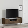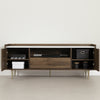 Do you like when your furniture is as beautiful as it is practical? This glam TV stand has more than one trick up its sleeve! Its distinguished style does not prevent it from having a water and scratch resistant vinyl surface as well as a very solid metal base. You can be assured of its durability. Behind the 2 doors are useful storage compartments to organize your accessories and devices. Take advantage of the central drawer to store those little mismatched items that are lying around the living room! This TV stand suits TVs up to 75 in and has a glamorous style that will spice up any family room! Its elegant gold brass legs and tab handles will effortlessly enhance your decor!
