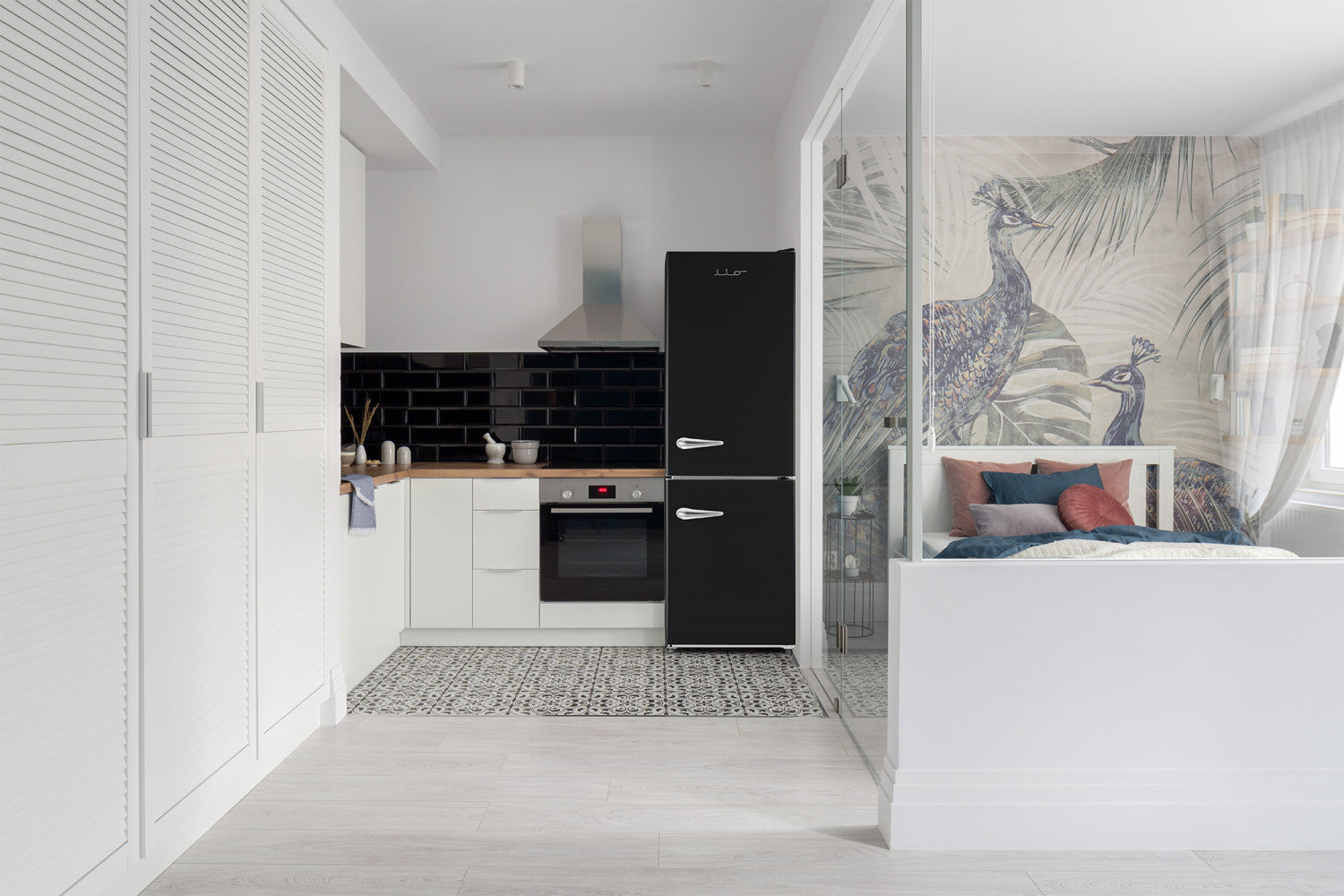 It's cool, it's stylish, it's fun. This retro-modern slim refrigerator has a surprising amount of adjustable space and square sides for side-by-side installation. With bright LED illumination, three safety glass shelves, a convenient frost-free top fresh food area, and a bottom freezer, the iio RM1 comes in gorgeous colour options to fit any decor. Truly where style meets function. This 11 cubic-foot Retro-Mod compact fridge offers a future-friendly blend of nostalgic design and modern angles, packed with the latest technology. The electronic controls are easy to reach and easy to use, allowing you to quickly activate the Fast Cool feature that rapidly chills the refrigerator compartment and your freshly-stocked groceries. Frost-free and with Multiflow 360-degree technology circulates cool air more efficiently around every shelf, through every drawer, and over every surface, keeping your food at the ideal temperature. A large bottom freezer, bright LED lighting, and three rollout freezer drawers all enable even the smallest space in your home to reflect your luxury style. This tall, skinny refrigerator comes with innovative features including chrome retro handles, a super fresh zone, and is ENERGY STAR certified. It's perfect for tight spaces and is a slim refrigerator that's perfectly sized for a small family home.