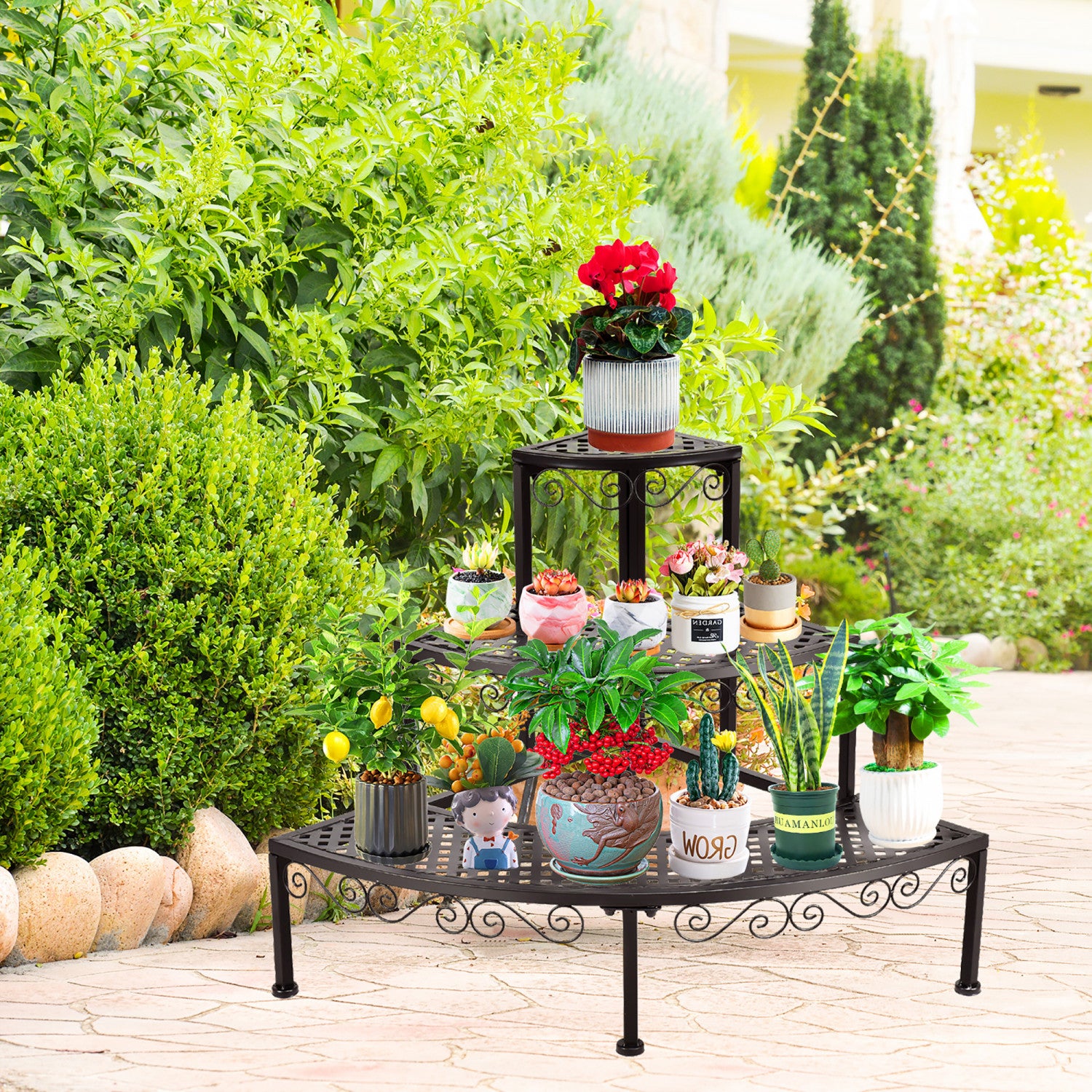 Are you still looking for simple retro ironwork plant stands? Here comes our fan-shaped 3-tier solid iron frame pot plant stand with pattern carving for exquisite look. The nordic style will bring you concise visual enjoyment. Anti-rust powder coated will keep it brand new look and for long lasting performance. Easy assembly within 5 minutes is needed. It’s lightweight for easy moving and relocation but featuring a strong bearing force, free you from worrying about plant pots are too heavy. Attentive plastic foot pads will prevent scratching the floor. 3-tier frame will accommodate more items. Metal mesh design for small potted plant free from falling, and easy cleaning. Fan-shaped design beautiful and chic perfects for all corners. Modern stylish nordic style matches most household styles. And it will be a great addition to patio, garden, classroom, etc. Green everywhere