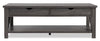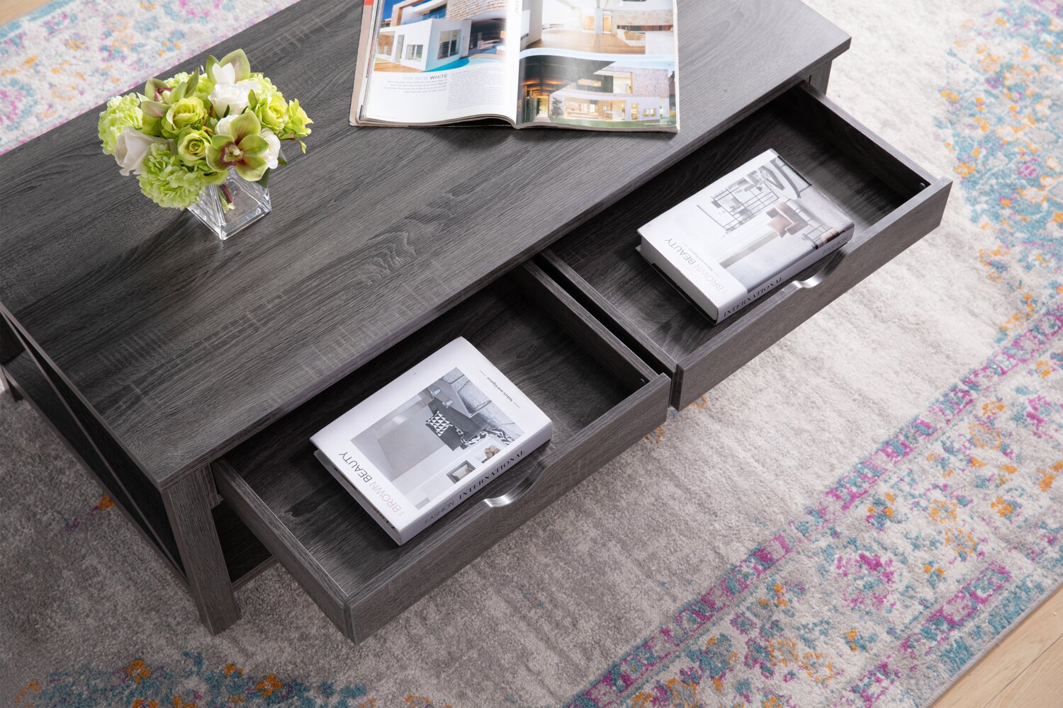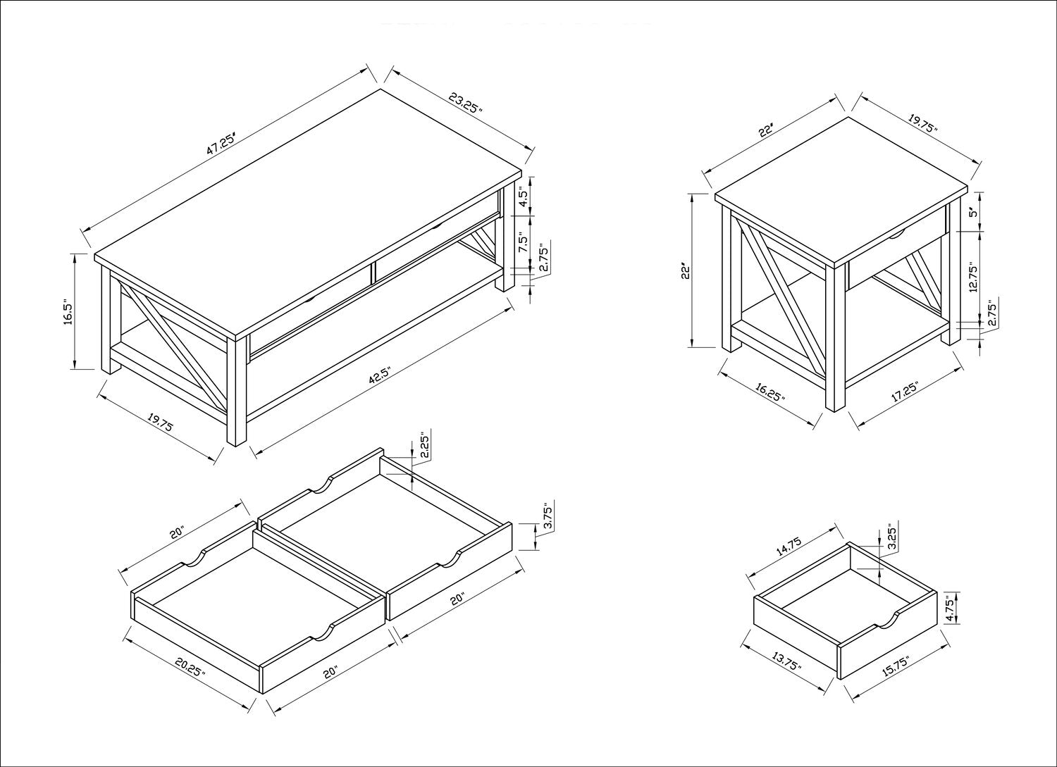 | Storage Options | The coffee table has two drawers and one shelf; the end table adds one drawer and another shelf for your storage needs. |