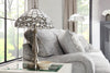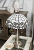 This Jasmin table lamp features a monochromatic art glass shade and a contemporary metal brushed nickel base. The glass panels in the shade present a gorgeous pattern filled with decorative swirls. The traditional look is completed with the pull chain switch. It’s an ideal lamp for any room's decor and will provide you with years of reliable and artistic lighting. A perfect choice for living rooms, bedrooms or offices, try displaying this lamp in pairs on matching end tables or nightstands for a designer look.