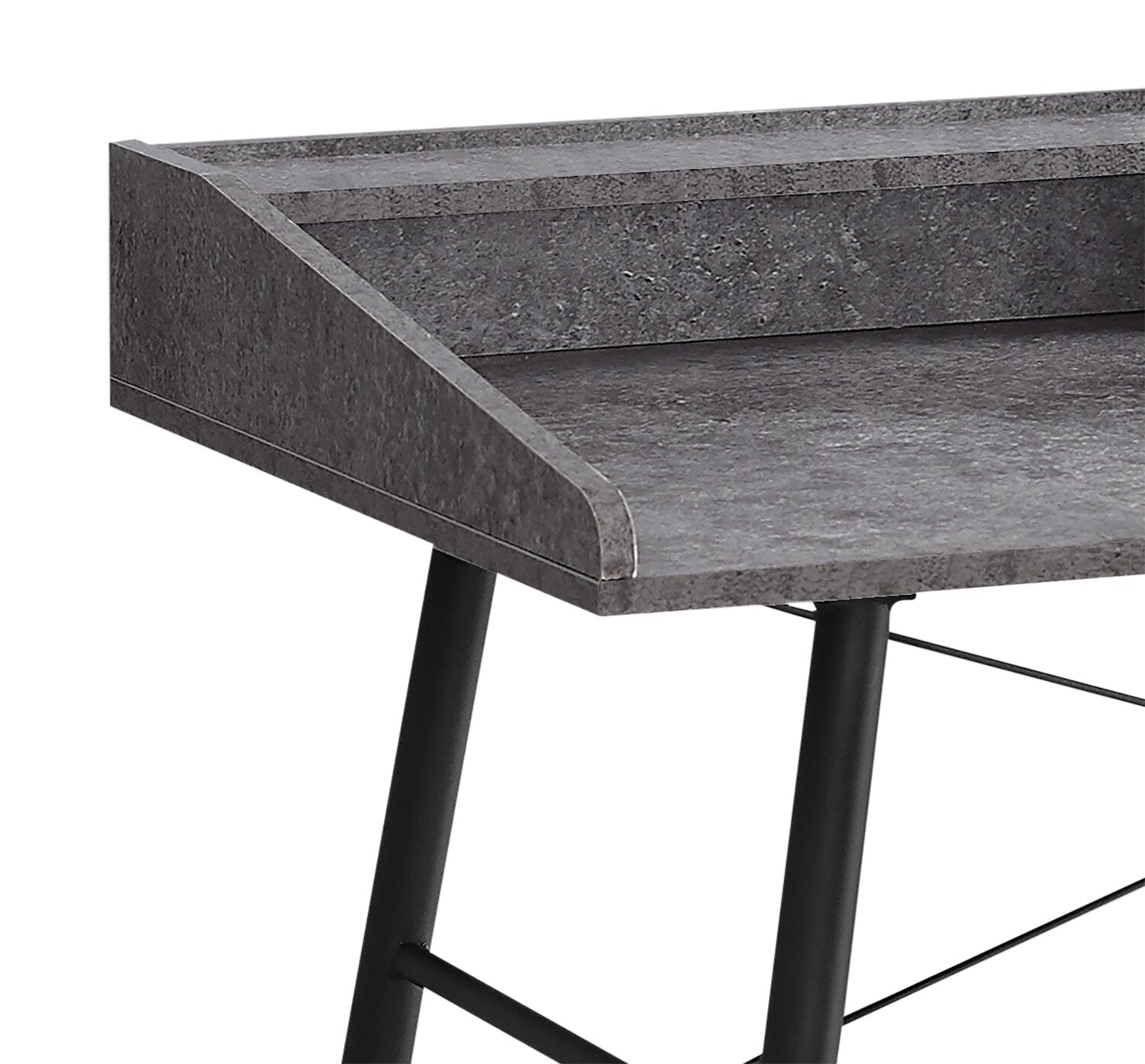 This Jeremy desk will take your office to the next level. The sides of the desktop gradually rise to meet the small hutch for a sleek look. The top of the hutch doubles as a shelf, while space underneath is divided into two storage cubbies where you can tuck away small items and keep your work surface organized. Providing support and stability is a metal base that features striking design details like tapered metal legs and slender X-shaped support bars. This laptop desk or writing table has a compact design and mid-century modern style that is a great choice if you use your living room or bedroom as an office.