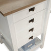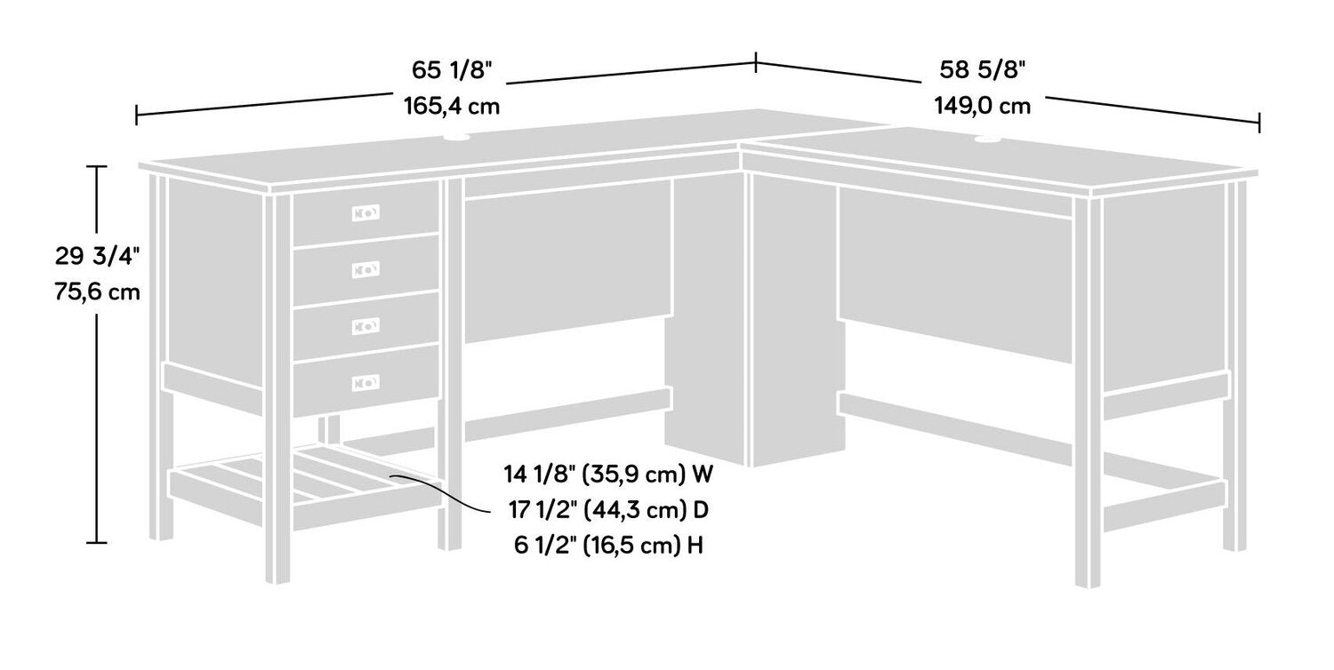 Make your workspace experience stylish and new but familiar and cozy, too, with this Joana L-shaped desk. This unit features a spacious top surface for your computer, a lamp and photos of your family. Two drawers with full extension slides make this L-shaped desk the perfect place for your office essentials. The lower drawer holds letter-sized hanging files so your most important documents are never far out of reach. A lower open shelf is perfect for additional storage and display of books, binders or a small storage bin. The importance of keeping your workspace tidy is accomplished thanks to the two desktop grommet holes for easy cord management. Finished in Soft White with Lintel Oak accents, this computer desk will transform your office into a cool place to be.