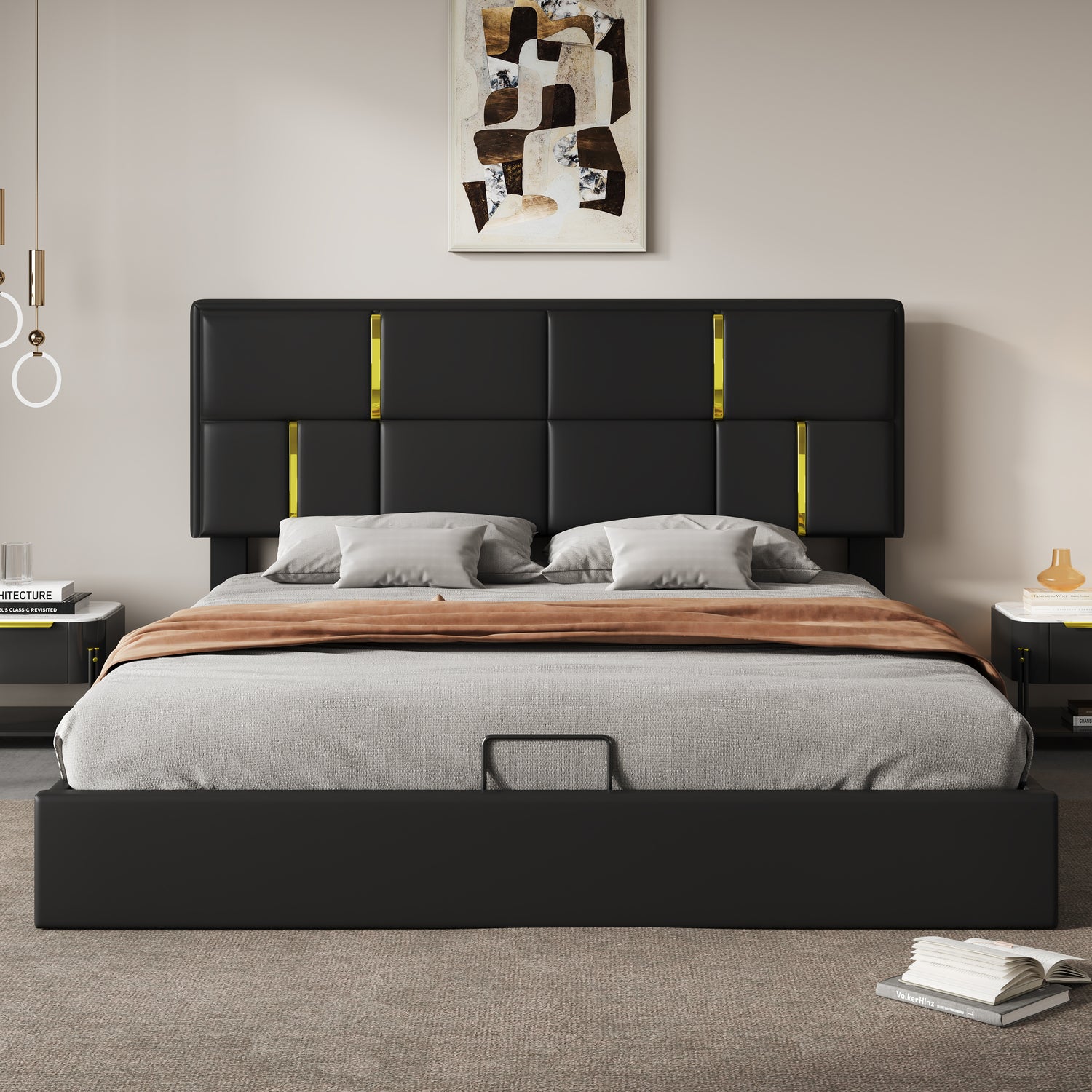 The upholstered platform bed combines modern elegance with smart functionality. Upholstered in soft velvet with a chic gold-accented headboard, it creates a cozy yet stylish centerpiece for your bedroom. The sturdy frame, crafted from engineered wood, plywood, and metal, supports up to 500 lbs for reliable durability. A hydraulic lift system provides hidden under-bed storage, perfect for quilts, linens, and essentials. Designed for convenience, this platform bed requires no box spring and comes with detailed instructions for easy assembly. Functional, durable, and timeless in design.