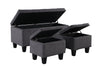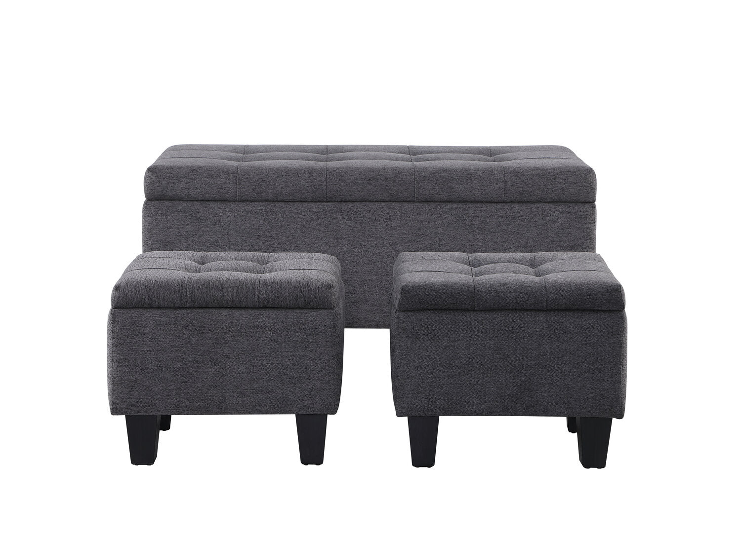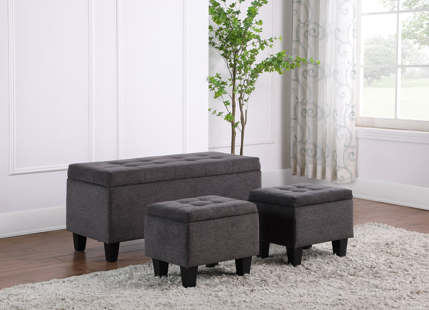 If you have a clutter problem, this Kai 3-Piece set of storage ottomans will solve it. Lift the lid on each of these ottomans to reveal space to neatly tuck away all kinds of home essentials. From blankets and pillows to toys and seasonal clothes, everything has a place to be. Elegant grey fabric is button-tufted to accentuate the plush foam stuffed inside and easily coordinates with most home decor styles. Whether placed in the entranceway, living room or at the foot of your bed, set up these Kai ottomans and you’ll wonder where the mess went.