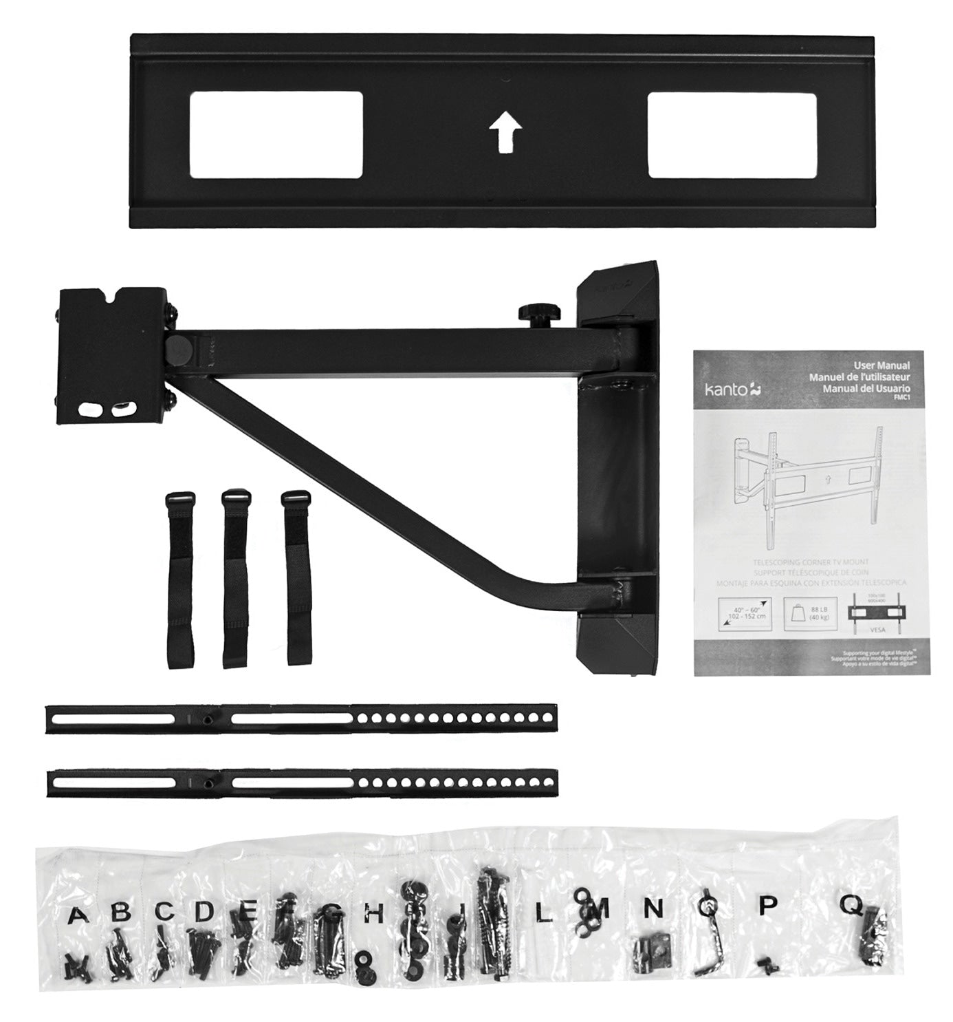 Make the most out of a smaller space and mount your television right on the wall with this telescoping corner wall mount from Kanto. The FMC1 works on either wood studs or concrete, making it the ideal solution for most homes, and perfect for any flat screen TV between 40 and 60 inches (up to 88 pounds). Finally, since this telescoping wall mount can be tilted left or right, there are plenty of ways to adjust the TV to reduce screen glare or improve line of sight.