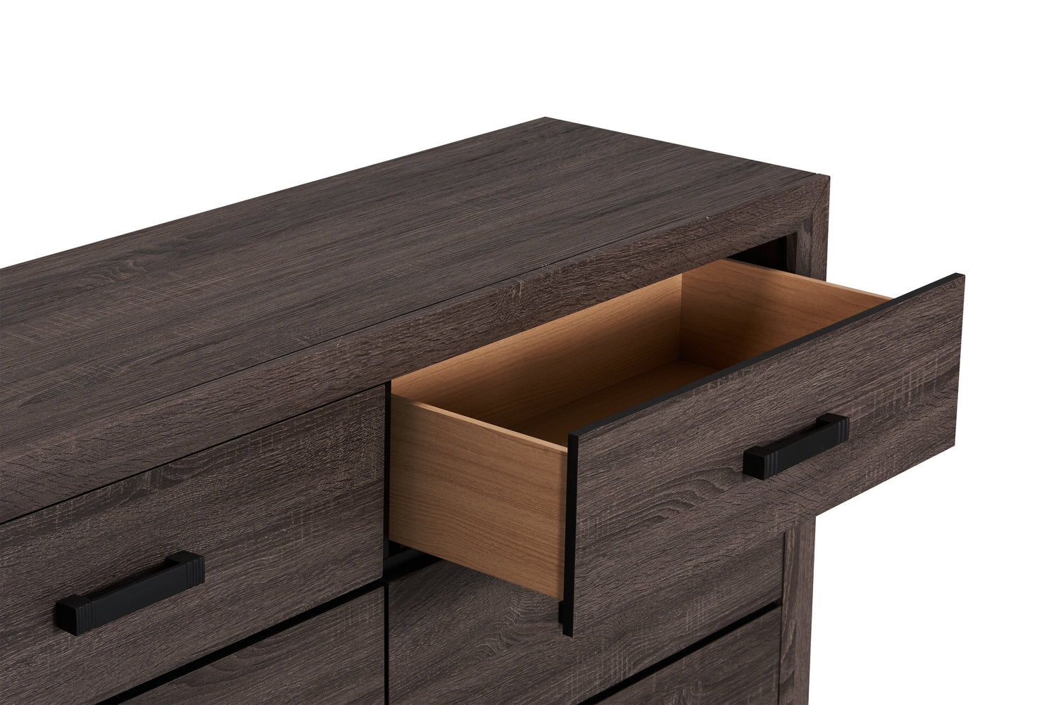 Give your bedroom upscale, urban charisma with this Kate dresser. The Asian hardwood frame is finished in a smoky grey-brown colour, creating a character-rich canvas for you to organize your clothing. The dark, tapered legs and matching black hardware create a two-toned look that takes this style to an even higher level of luxury. Enjoy this dresser on its own or pair it with the mirror from the same collection (sold separately).