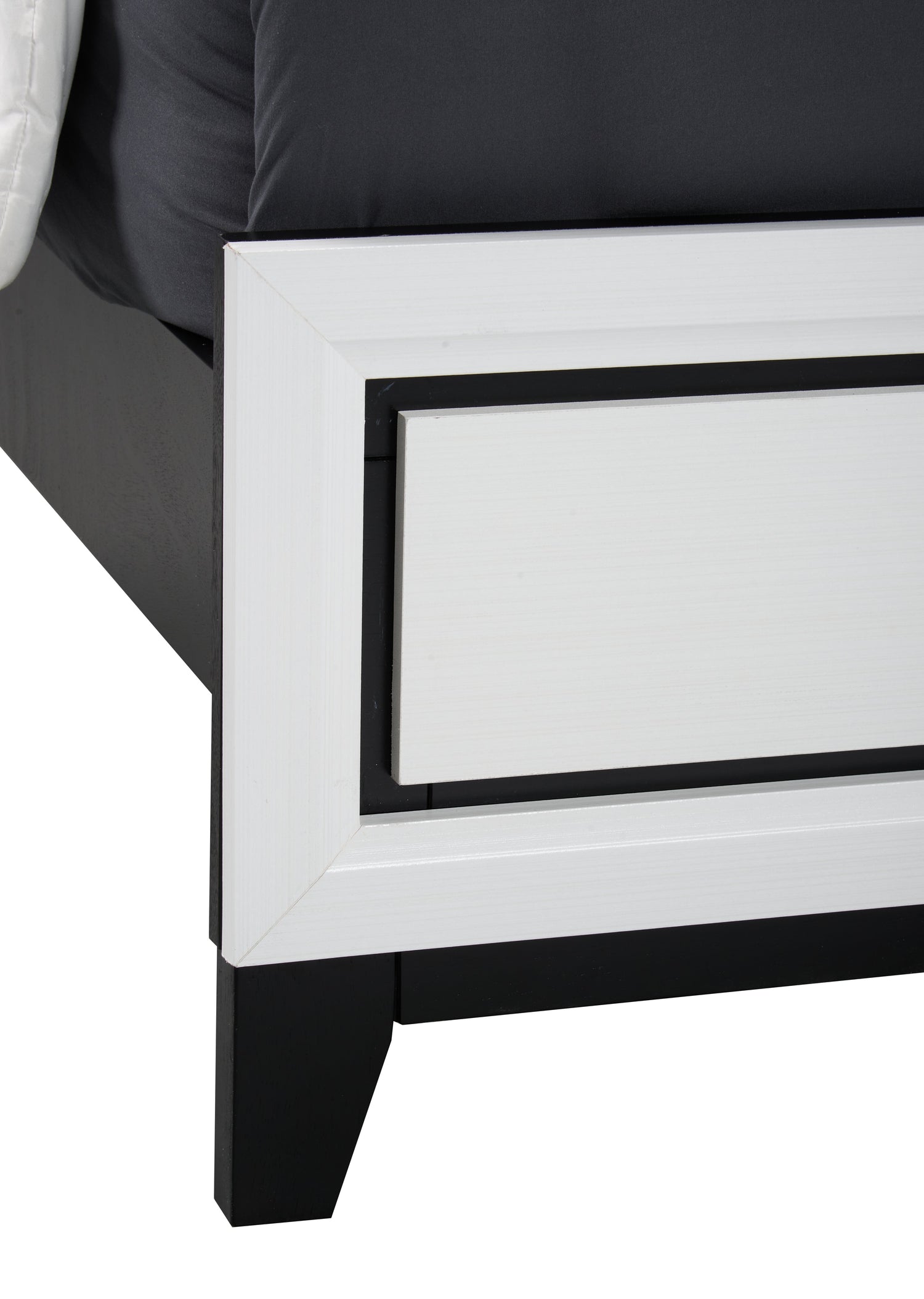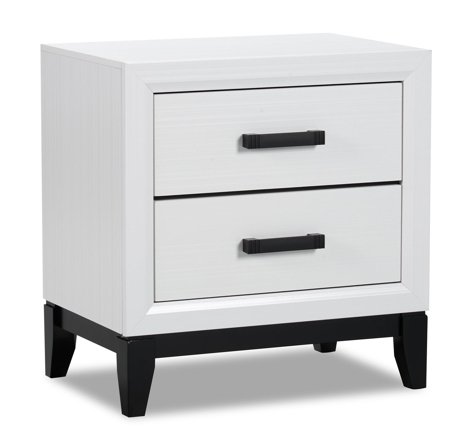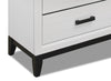 | Hardware | Black drawer pulls add modern style. |