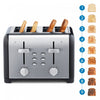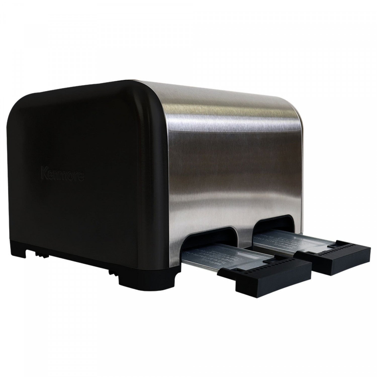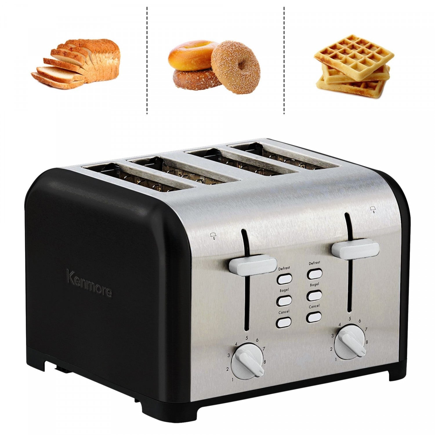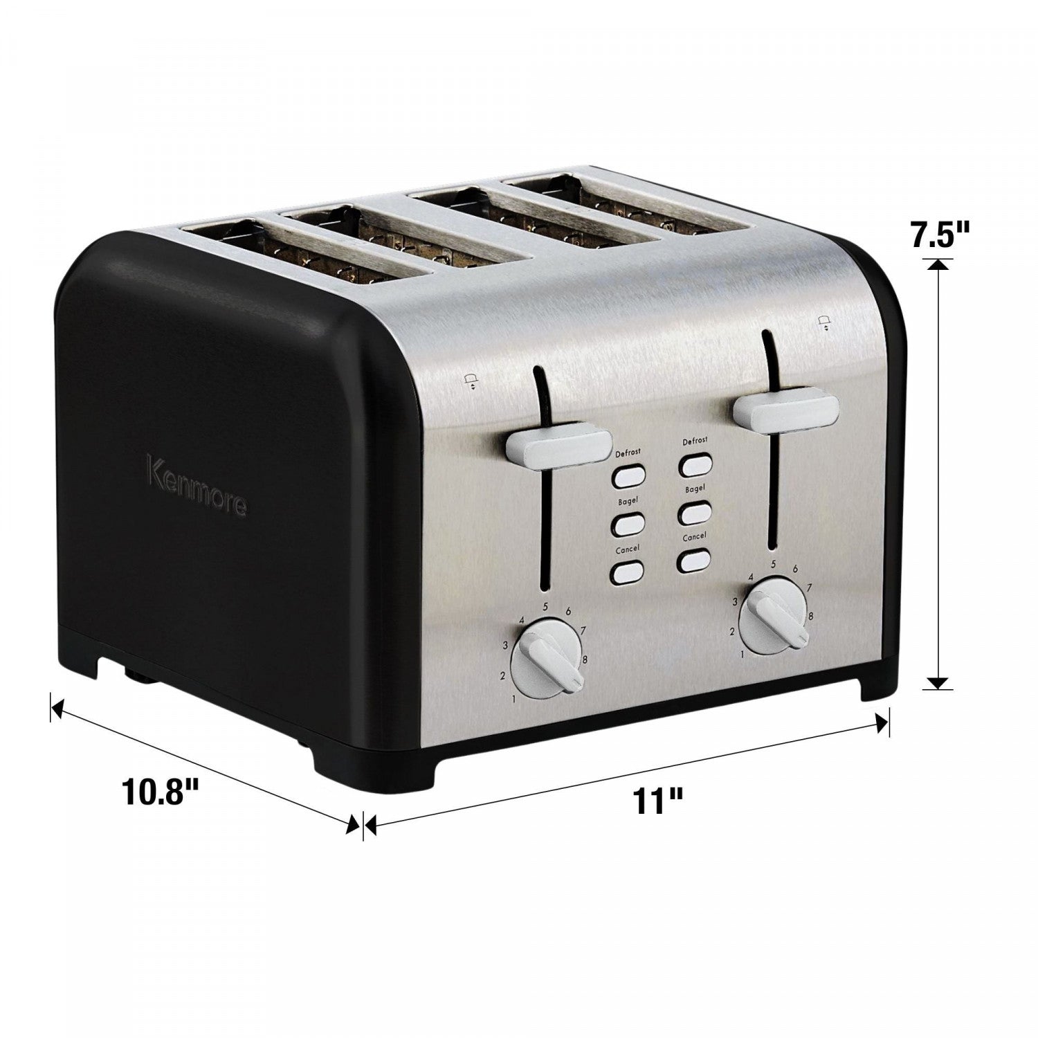 Toast or defrost your way to a delicious healthy breakfast with this 4-slice stainless steel toaster from Kenmore. From English muffins to Texas toast, this 1400W toaster accommodates everything with its extra-wide slots and self-adjusting bread guides, and the numbered dial offers 9 shade settings so you have plenty of options to suit your family's individual taste. Prepare 4 slices of bread at once, defrost toaster strudels or tarts, or toast perfect bagels with individual controls that let you choose the settings for each half separately. The attractive stainless steel housing easily wipes clean and the separate BPA-free crumb trays are completely removable for hassle-free cleanup. With double the capacity of typical toasters you can quickly make enough for a crowd, leaving you lots of time to simply sit and enjoy your breakfast. Best of all, Kenmore products are backed by a 2 year limited warranty for your peace of mind.