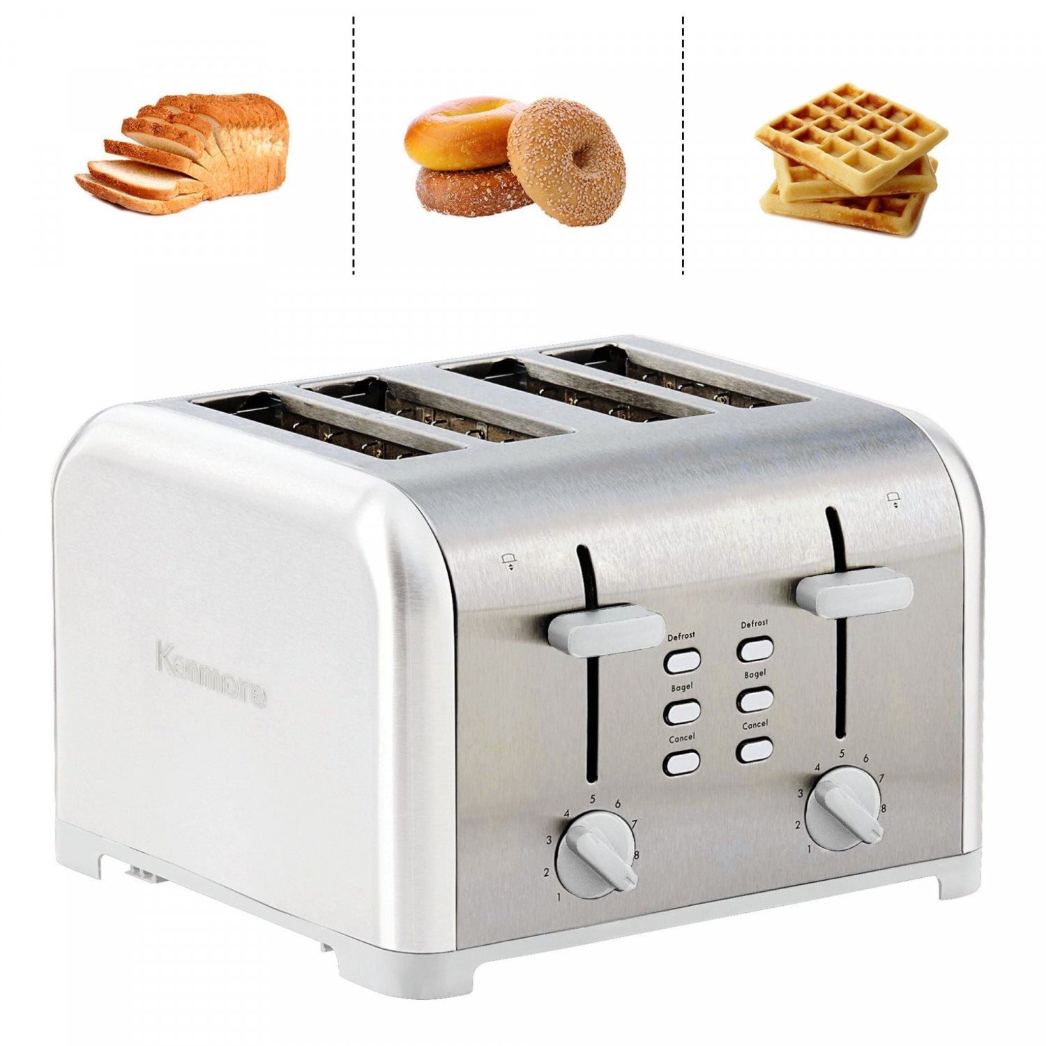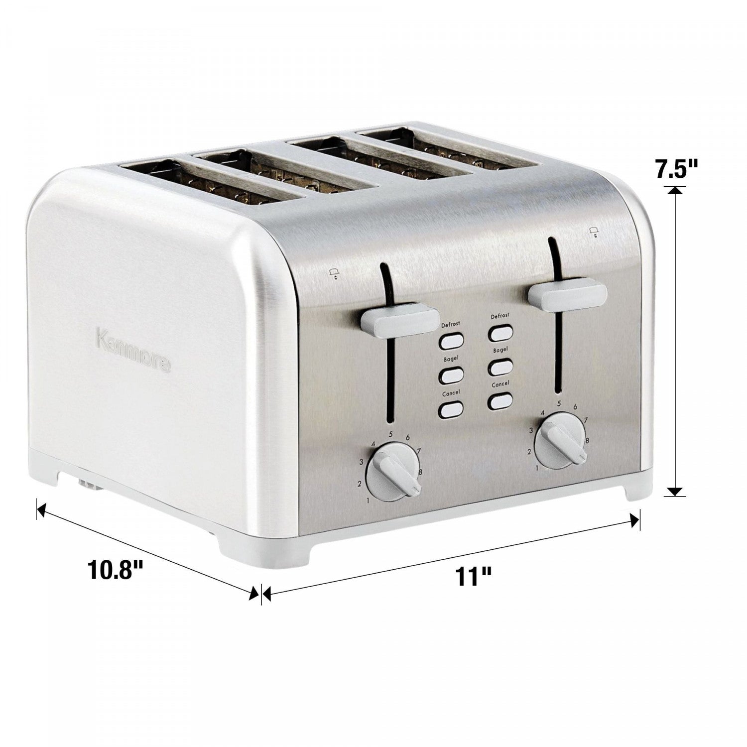 Toast or defrost your way to a delicious healthy breakfast with this 4-slice stainless steel toaster from Kenmore. From English muffins to Texas toast, this 1400W toaster accommodates everything with its extra-wide slots and self-adjusting bread guides, and the numbered dial offers 9 shade settings so you have plenty of options to suit your family's individual taste. Prepare 4 slices of bread at once, defrost toaster strudels or tarts, or toast perfect bagels with individual controls that let you choose the settings for each half separately. The attractive stainless steel housing easily wipes clean and the separate BPA-free crumb trays are completely removable for hassle-free cleanup. With double the capacity of typical toasters you can quickly make enough for a crowd, leaving you lots of time to simply sit and enjoy your breakfast. Best of all, Kenmore products are backed by a 2 year limited warranty for your peace of mind.