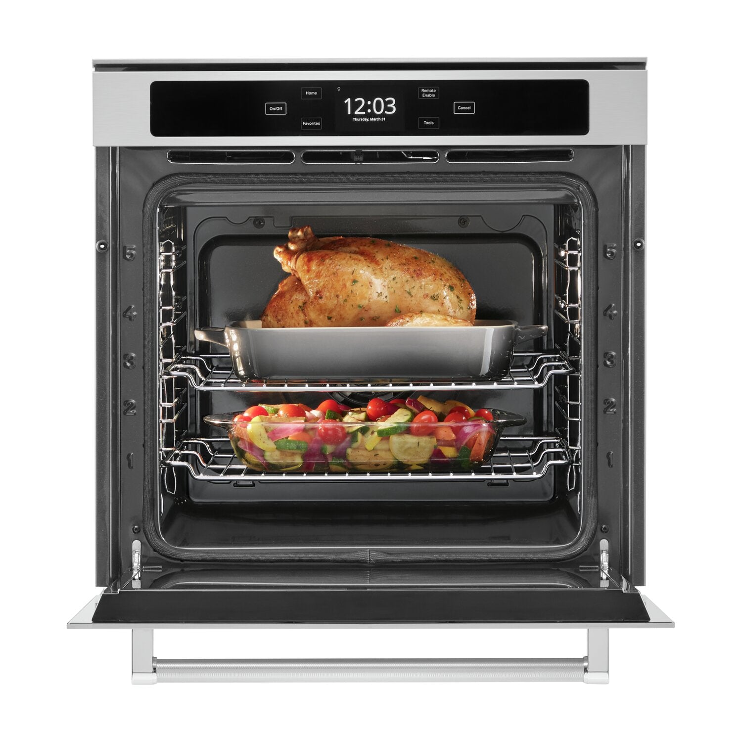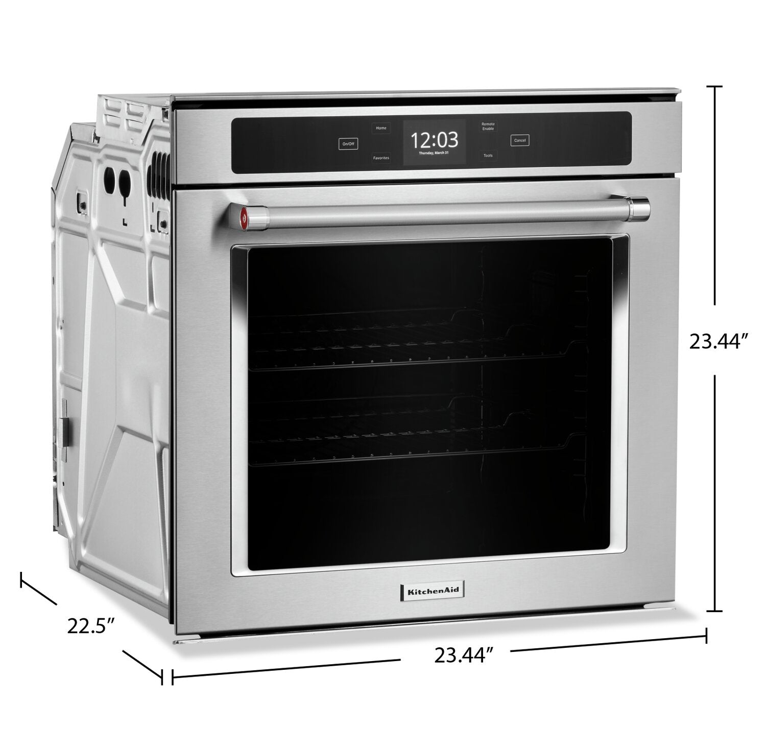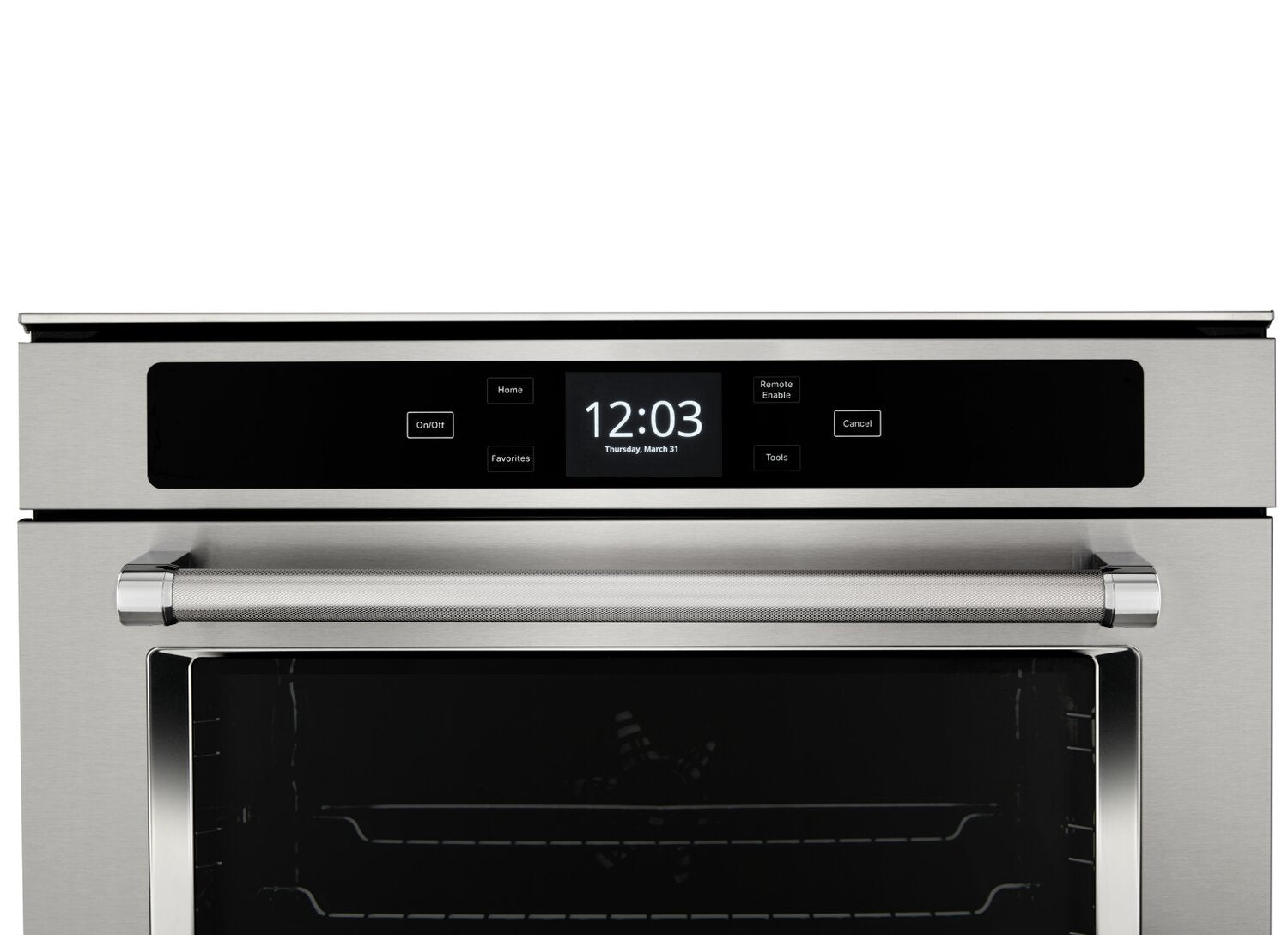 Prepare your meals in style with this KitchenAid wall oven. True Convection creates even hot air distribution, so you’re ready to impress with delicious cookies, juicy roasts and flavourful caramelized vegetables. Select cooking modes, times and temperatures with ease thanks to a large, full-colour touch display – or, utilize your smartphone or voice control courtesy of handy Wi-Fi connectivity. A flush installation option and fingerprint resistant stainless steel finish bring a polished look to both this wall oven and your kitchen.