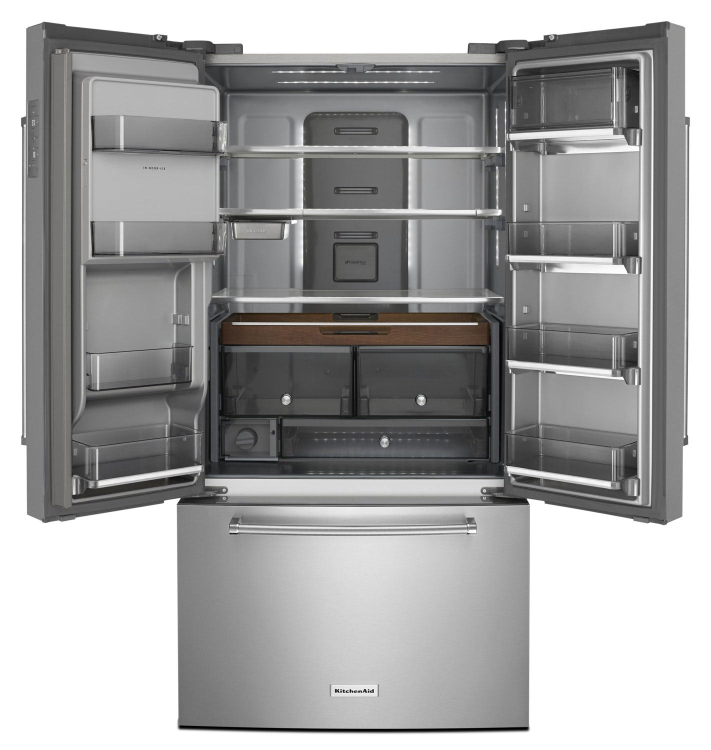 Choose a refrigerator that's beautiful inside and out with this KitchenAid French-door refrigerator. A PrintShield™ stainless steel finish makes the stylish exterior easy to maintain. As functional as it is fashionable, this fridge features the Preserva® food care system with independent fridge and freezer cooling to promote fresher food, plus FreshSeal™ crispers that extend the life of produce.