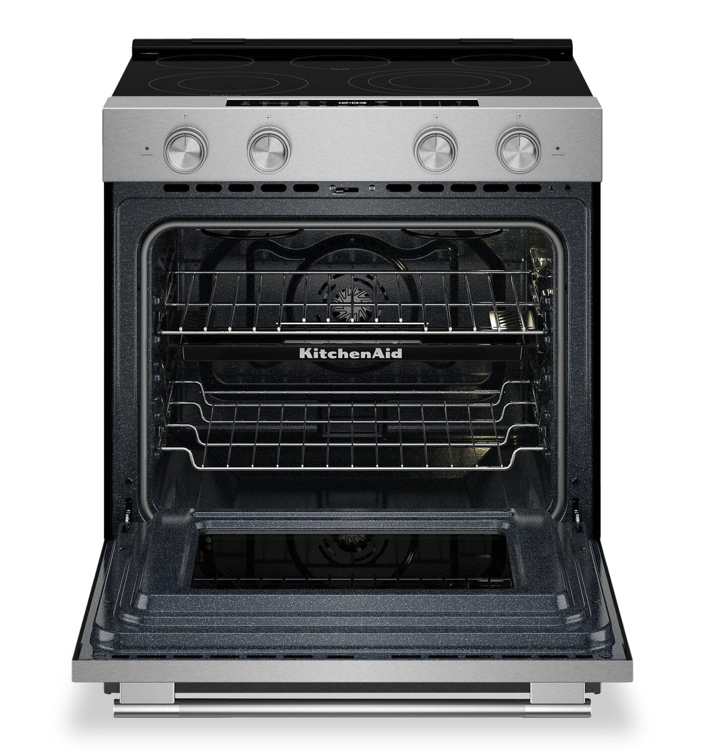 Most Powerful KitchenAid 30-Inch Electric Range Available: Two Even-Heat Hyper Elements: Convection Cooking Modes: Steam Bake Mode with Steam Bake Tray: Smart Appliance: 5.3 Cu. Ft. Capacity with Rapid Preheat: |