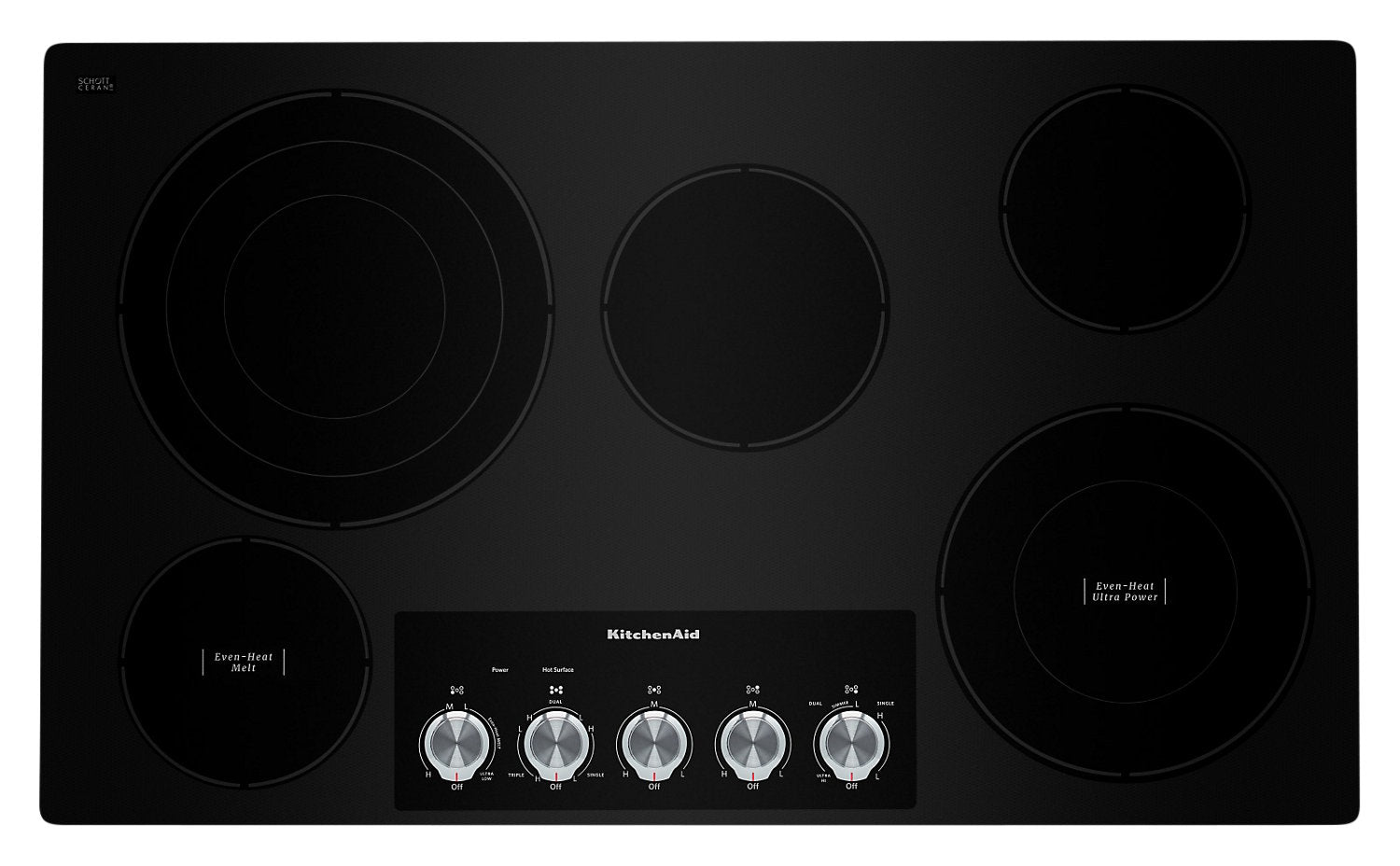 Combine powerful cooking options with sleek style when you get this KitchenAid 36-inch electric cooktop. A fifth triple-ring round element maximizes your flexibility with three distinct ring-sizes to match the size of whatever cookware you’re using. The 10-inch Ultra Power™ element maintains a constant supply of power for a range of settings, so dinner can be done right every night. Clean up is easy with the ceramic glass smooth top, plus always stay safe with the LED hot surface indictor light to warn you when the stove is still too hot to touch.