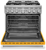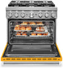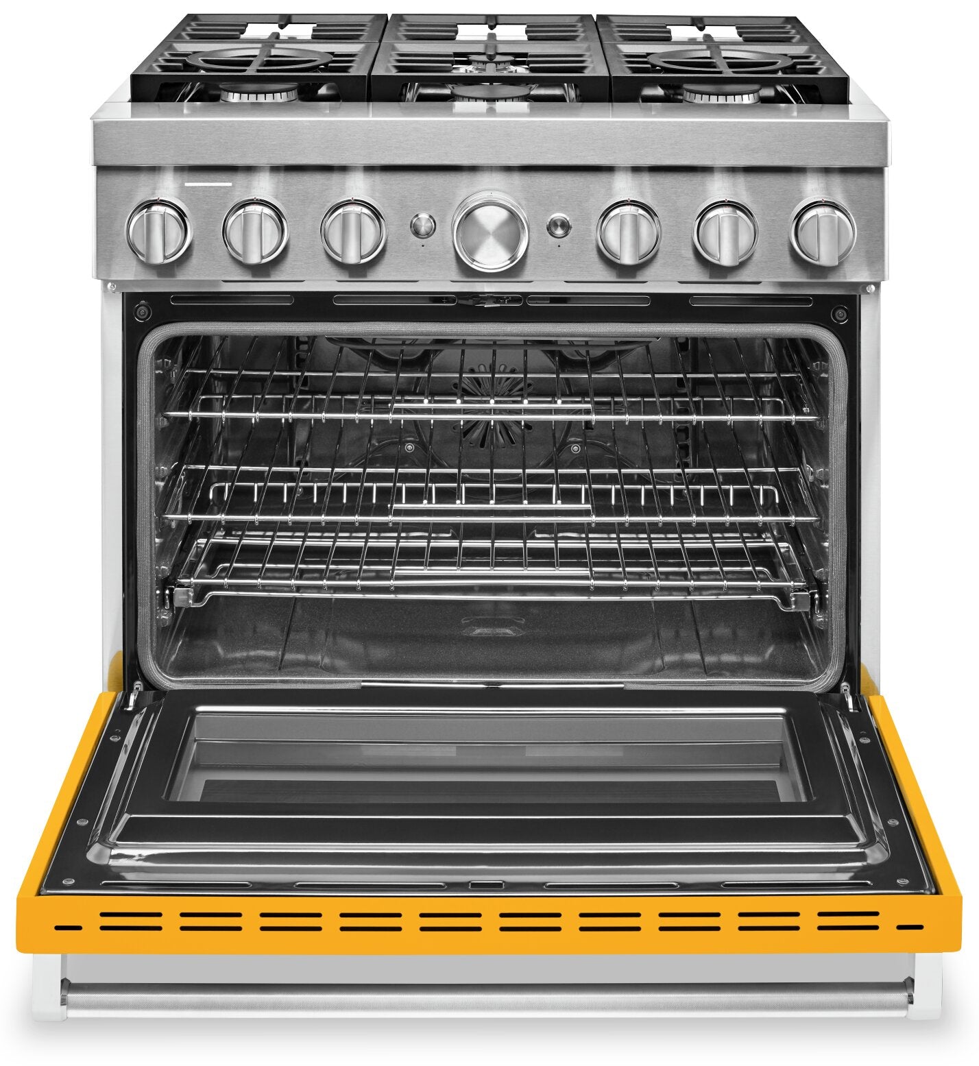 Empower your creativity in the kitchen with this 36-inch commercial-style range by KitchenAid. This gas range combines a powerful six-burner cooktop with the even baking of a convection oven. Two versatile 20,000 BTU Ultra Power™ dual-flame burners offer the power and precision to sear, simmer, stir-fry and sauté. Even-Heat™ True Convection helps you achieve more consistent baking and roasting. This smart range is compatible with your Google Assistant or an Amazon Alexa-enabled device to preheat, proof, bake and roast from anywhere using the KitchenAid app.