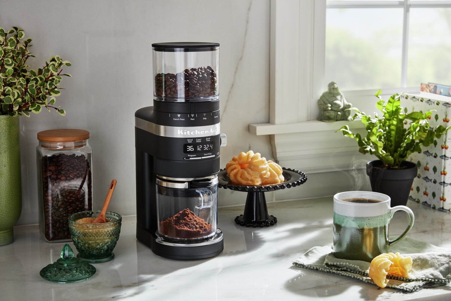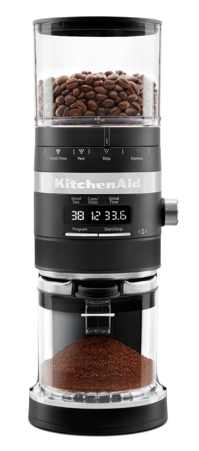 This KitchenAid Burr coffee grinder achieves consistent results for your favourite drinks. From French press to espresso and much more, 70 precise settings provide exceptional grind sizes. Plus, the Automatic Smart Dosing Technology takes the guesswork out of dosing and automatically adjusts grind time to deliver the proper volume and consistency. This grinder’s compact design fits under most kitchen cabinets, so it’s easy to access and great for everyday use.