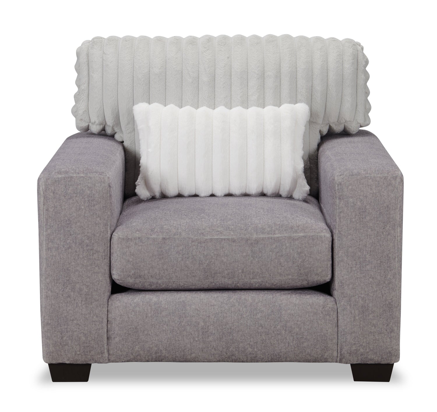 | Accent Details | Grooved light grey polyester wraps the back cushion and accent pillow, creating a unique appearance of contrasting fabrics. |