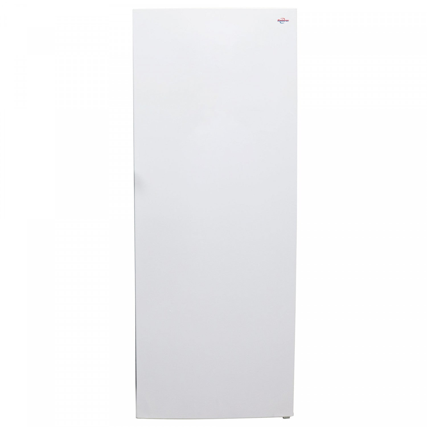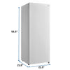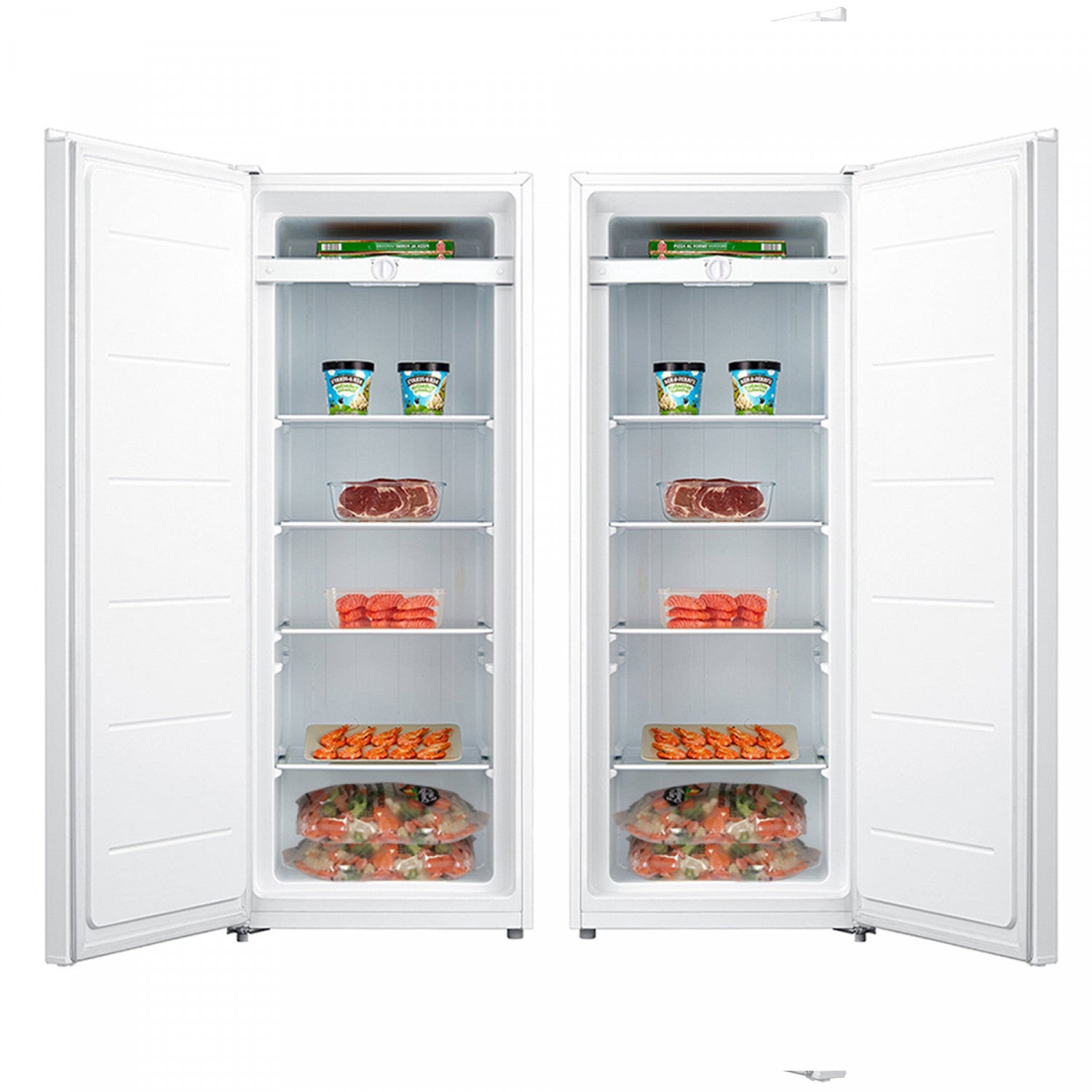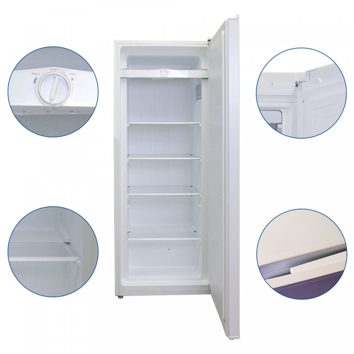 Garage-ready upright freezer is perfect for your basement or outbuilding: With premium insulation and technology to protect electrical components from extreme outside temperatures and maintain consistent operation, this "garage-ready" upright freezer is ideal for your garage, basement, or shed. Its generous 7.0 cubic foot (198 liter) capacity offers plenty of convenient storage for all your frozen goods so you can buy in bulk, reduce food waste and save money. Four removable tempered glass shelves let you organize your contents to be accessible when you need them and the unique top section is the perfect size for your favorite frozen pizzas. The classic white freezer features a space-saving flat back design with enclosed evaporator coils and a reversible door that can be installed to open left or right to suit your space. Reliable compressor cooling technology keeps contents at your desired temperature with a range of 0 to -24°C (32 to -11.2°F) with minimal frost build-up.