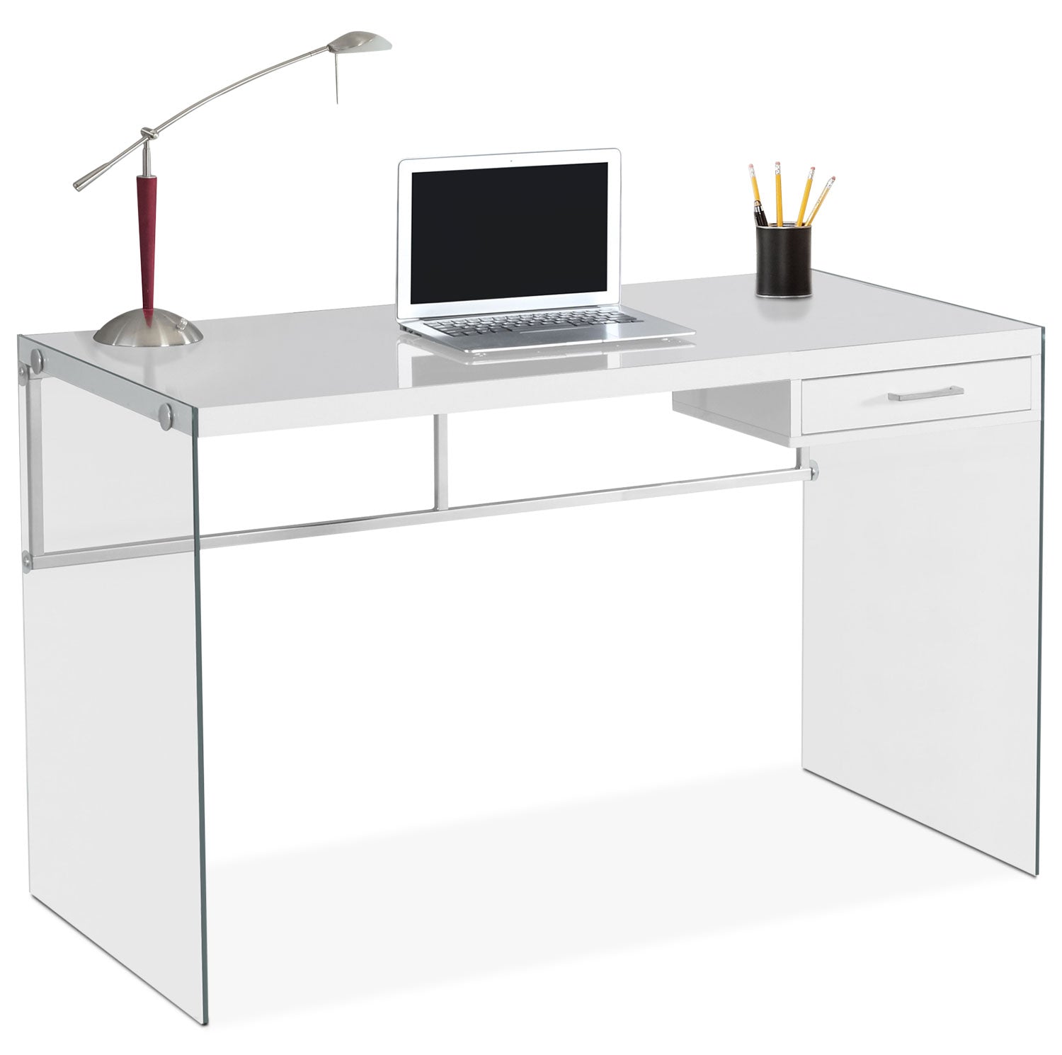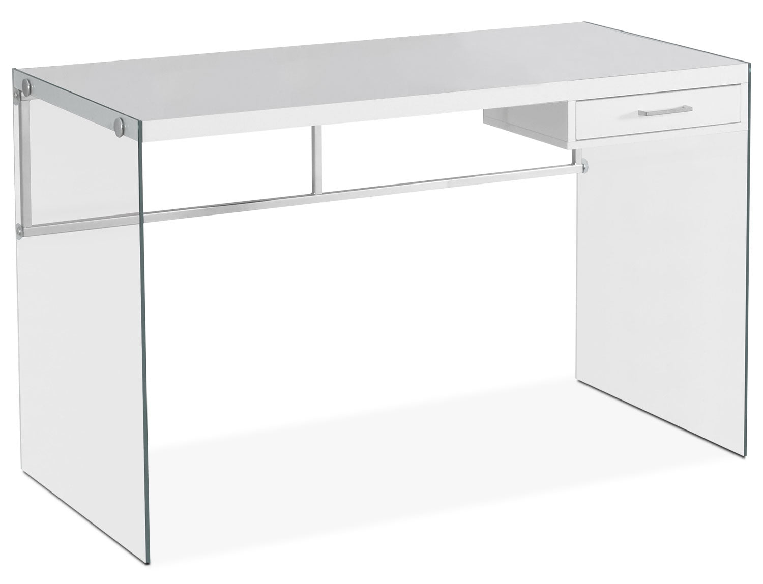Function and style combine in one irresistible piece of furniture with this Kylie computer desk. The single storage drawer offers space to tuck small items away while maintaining the beauty of the desk's minimalist design. Elegant and sleek, the glass legs provide a sturdy foundation for the white tabletop. Great for big and small spaces alike, this desk will find its rightful place in your office.
