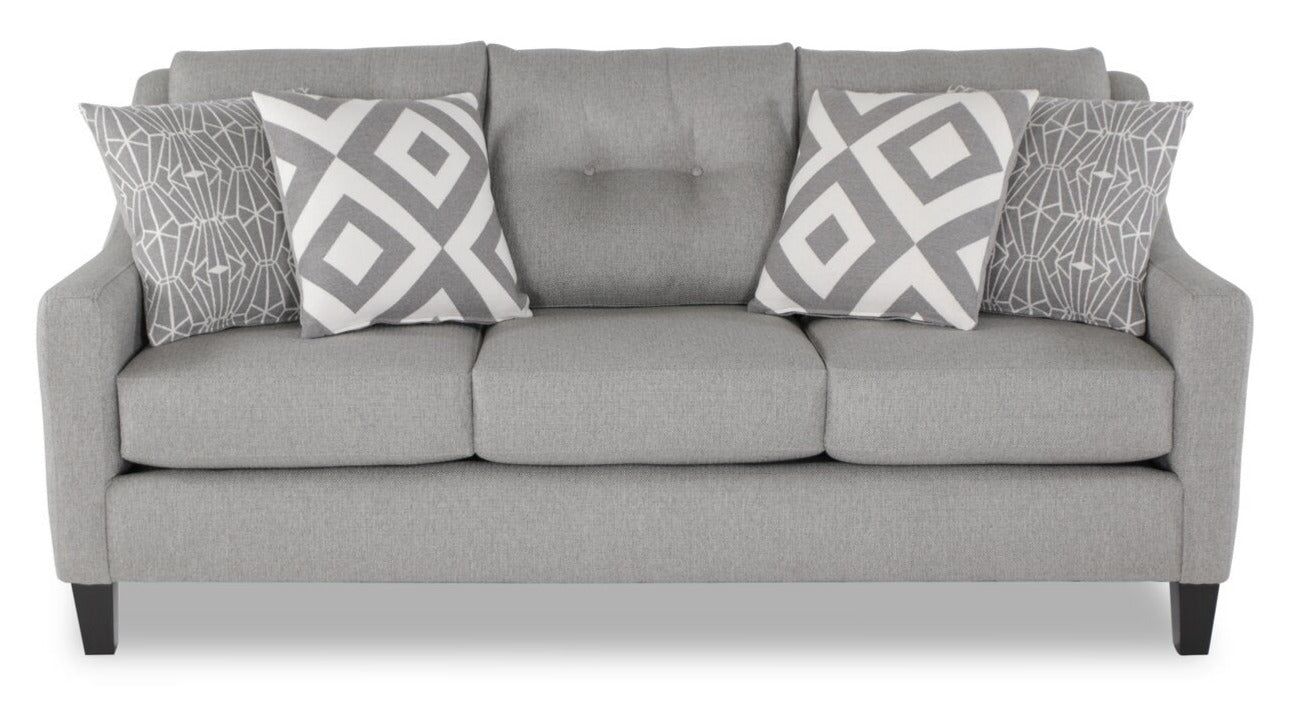 | Accent Pillows | This sofa includes four accent pillows - two cream and grey diamond-patterned cushions and two grey pillows with off-white-lined geometric designs. |