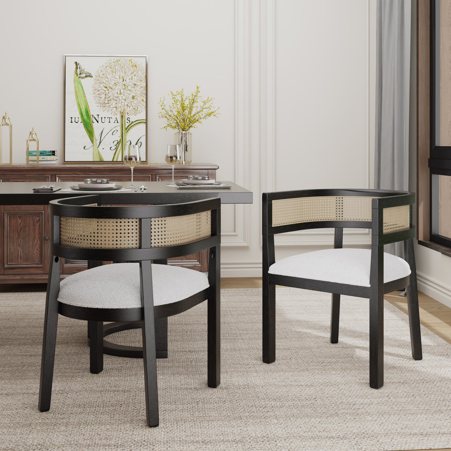 Add refined comfort and modern flair to your dining space with this set of two contemporary dining chairs. Designed with a unique rattan round backrest and sleek ladder-style frame, these chairs blend natural textures with bold black accents. The u-shaped seats are upholstered in soft beige polyester-blend fabric with foam padding for lasting comfort. Crafted from eco-friendly wood,they feature a durable structure and a sophisticated silhouette that suits a variety of dining settings. Assembly is simple,with all required tools and instructions included.