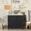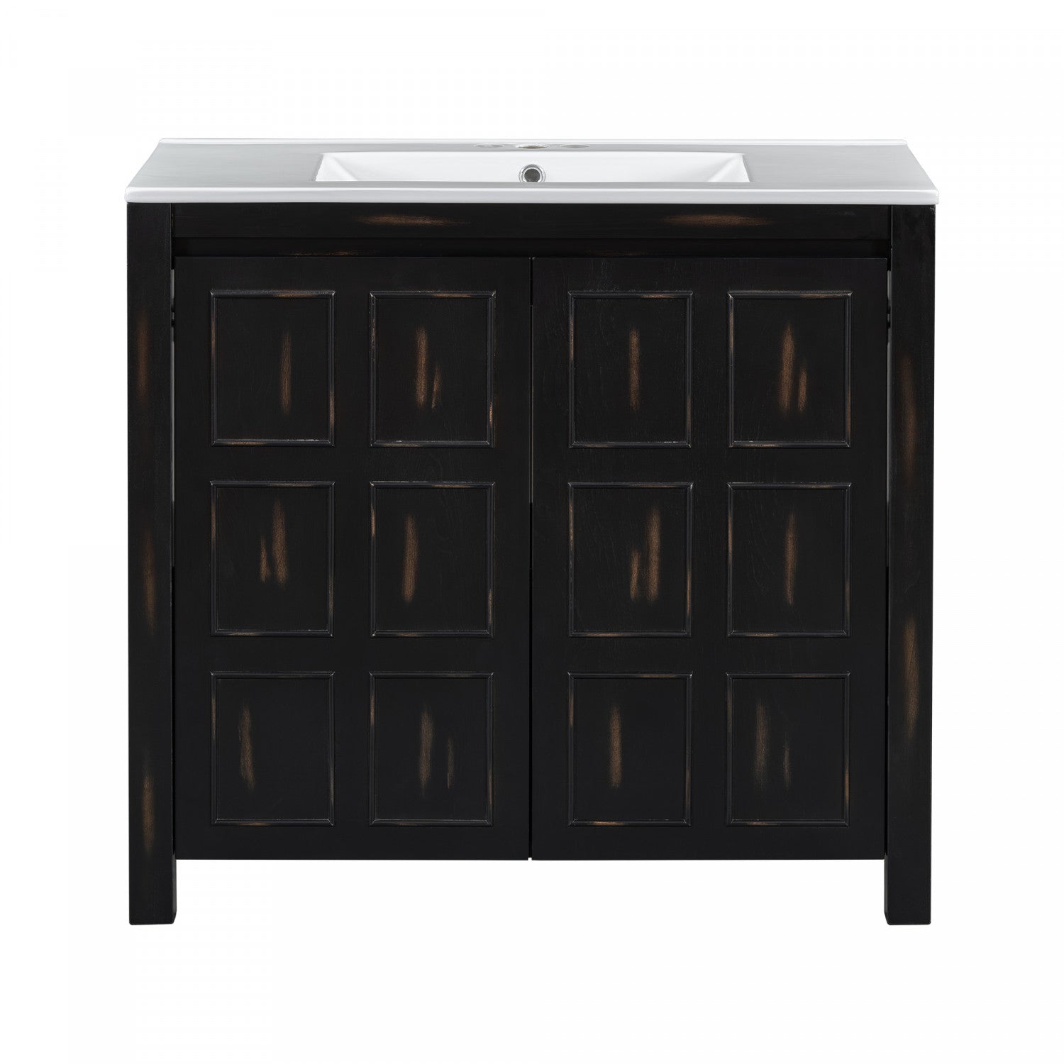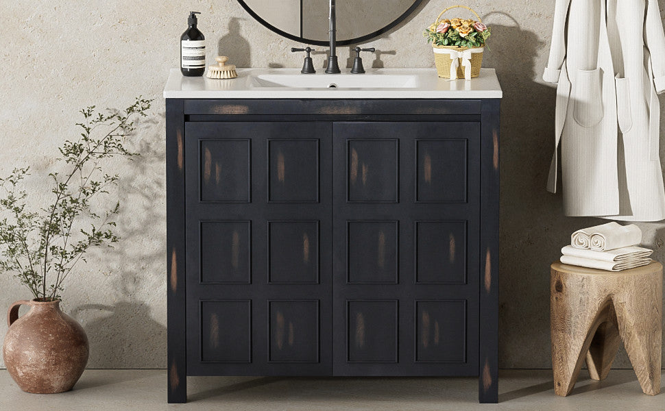 Upgrade your bathroom with this 36-inch bathroom vanity, combining rustic charm with practical storage. Crafted from solid wood and engineered wood, it features a durable frame and a smooth ceramic sink for easy cleaning. The distressed espresso finish, hand-painted by artisans, adds a unique and timeless character. Soft-close doors and concealed handles maintain a sleek, quiet operation, while generous storage behind the doors keeps towels and toiletries organized. Suitable for freestanding installation, this vanity blends style and functionality for a refined bathroom experience.
