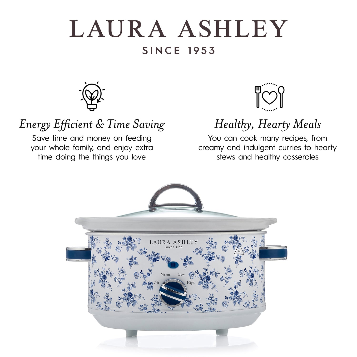 Make cooking a stress-free experience with the Laura Ashley stainless steel slow cooker. It has a generous 3.5-litre capacity, perfect for making family stews, soups, and casseroles. Use the 3-heat settings, including a keep warm function, and you will always have a delicious dinner ready when needed. The tempered glass lid traps the moisture and flavour of your dish, allowing you to watch the cooking process. The removable pot also makes for easy cleaning, as it is safe to put in the dishwasher. Plus, non-slip feet keep your device firmly in place. Each slow cooker also features the stunning Laura Ashley China Rose designer hand-applied print to beautifully style your home and kitchen.