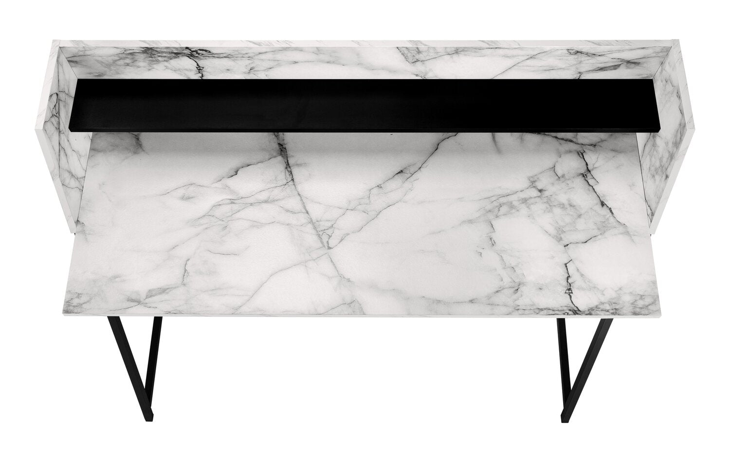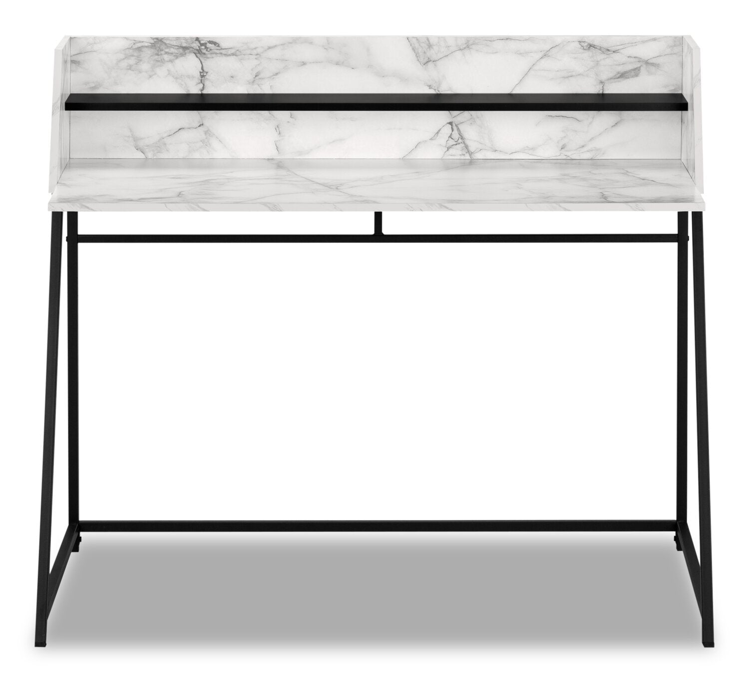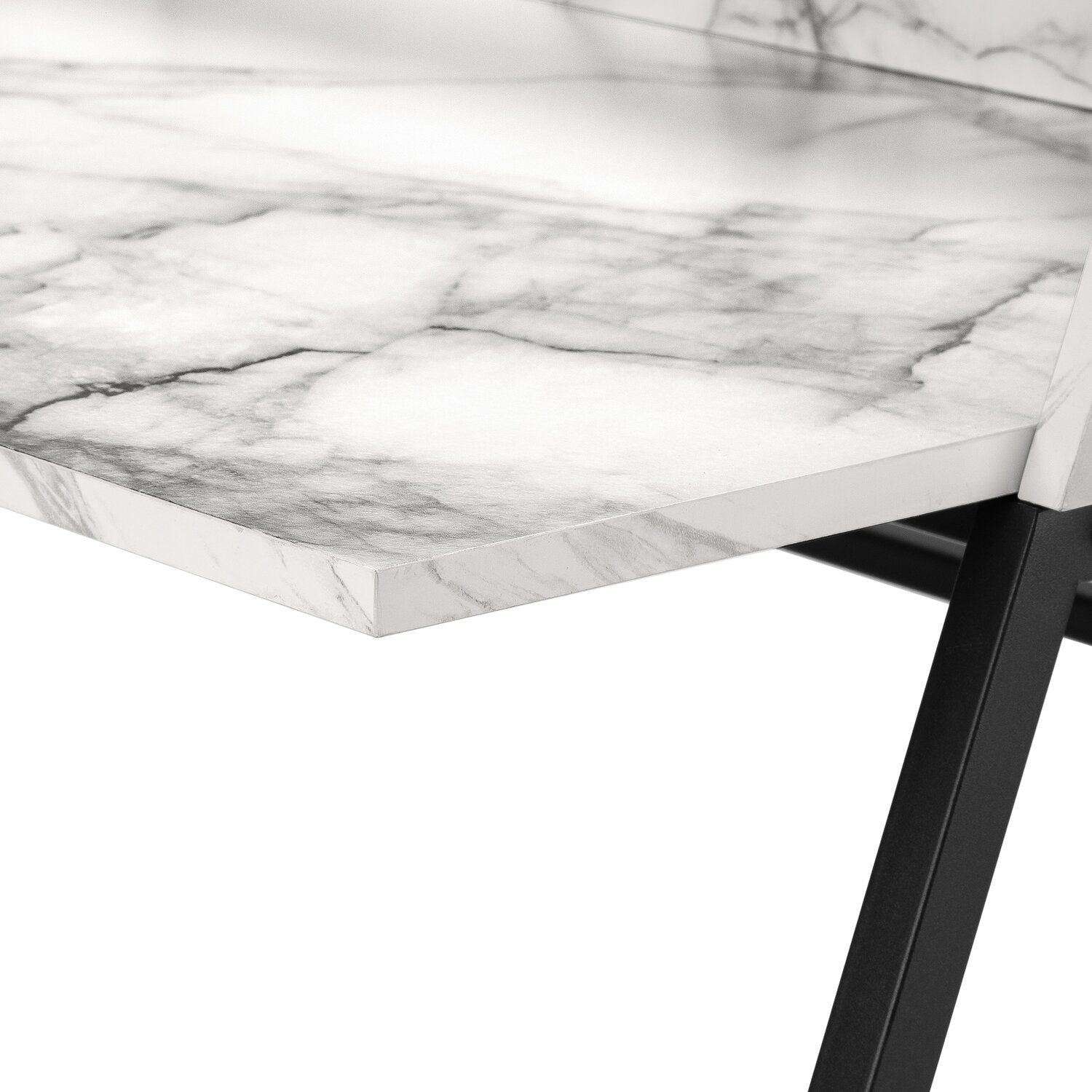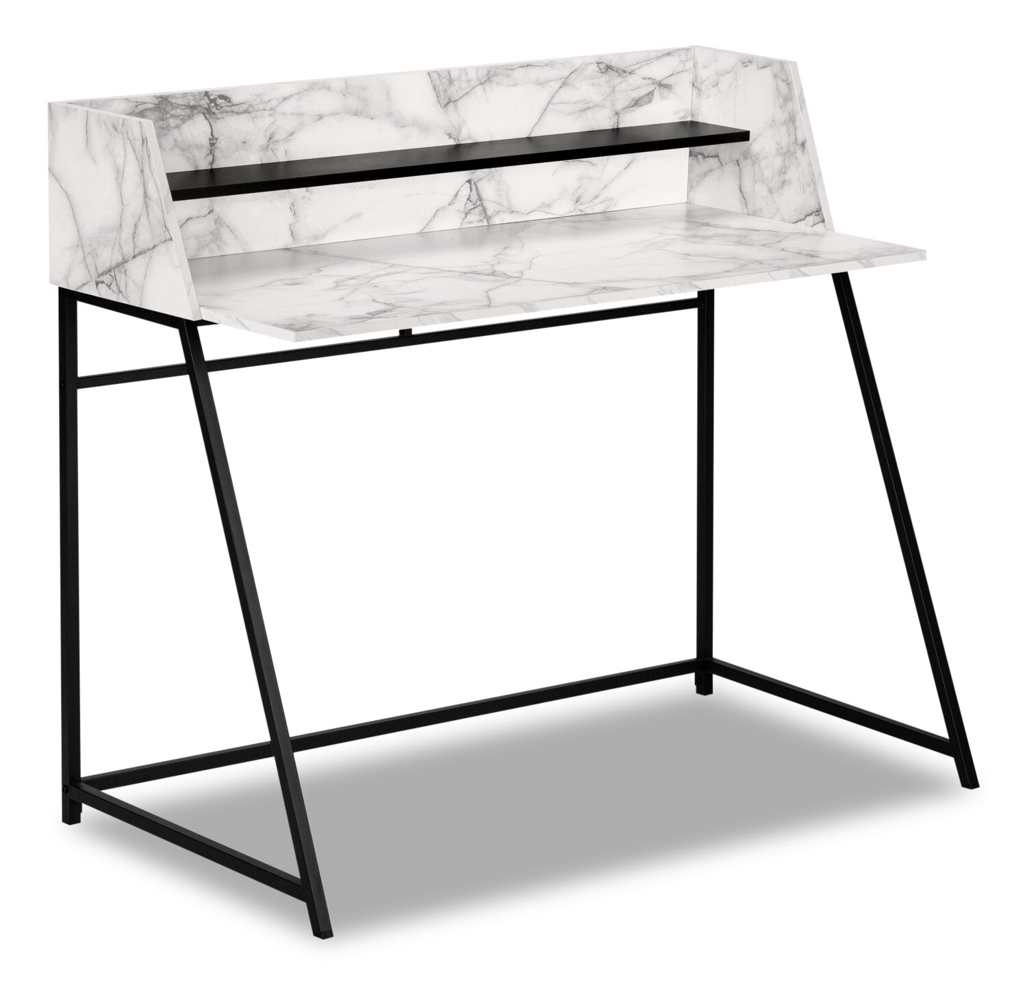 Look at your office from a different angle with this Lawson desk. Finished in a smooth laminate, the compact desktop has side panels that slant to seamlessly align with the attractive trapezoid-shaped metal legs for a clean look. The storage hutch includes one long shelf in a contrasting black finish that’s the ideal size to hold small items like wireless speakers or a pencil holder. Supporting the desktop is a sturdy black metal base. This contemporary desk with a space-saving design is a great choice to make any room your new workspace.