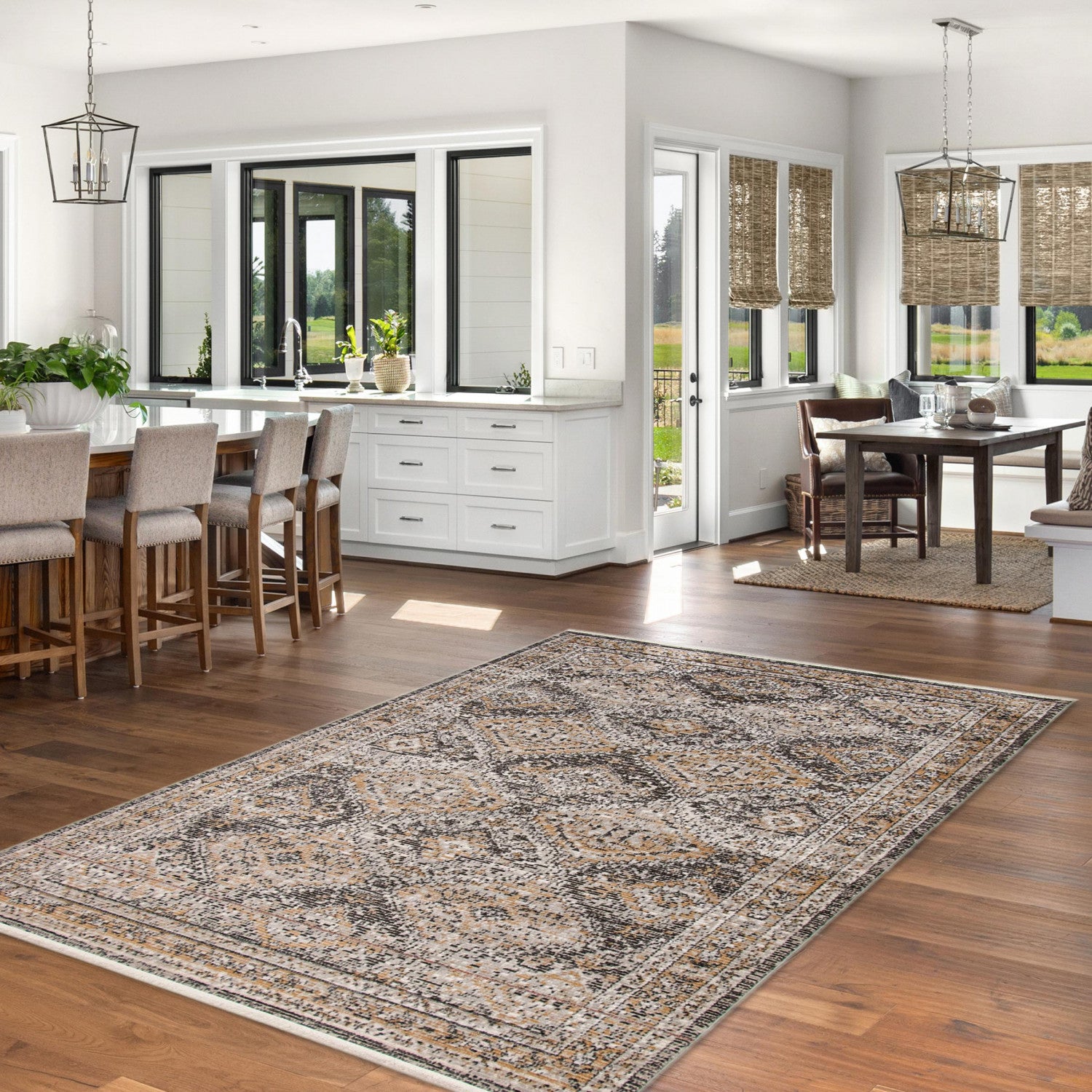 The leandra area rug collection encompassing the newest looks in trend-setting transitional and contemporary styled area rugs. Featuring a smart array designs in traditional and oriental motifs drenched in fashion-forward hues. Leandra area rugs offer opulent decor for your living room, dining room, and bedroom. Constructed using soft synthetic yarns in a moderate plush pile and finished with petite fringe. Family friendly and great for high traffic areas and very pet friendly too.
