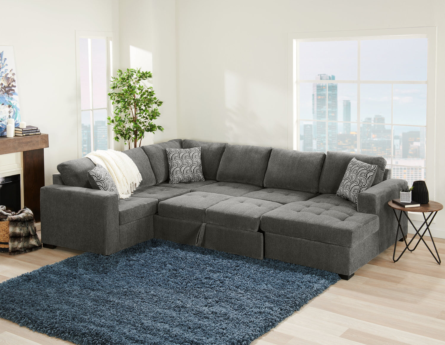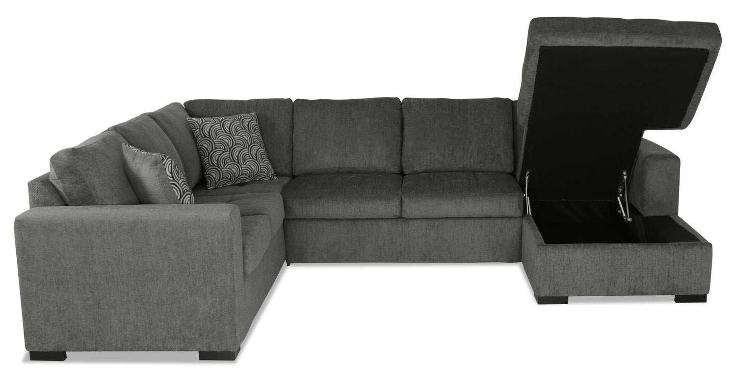 In a busy life, multipurpose furniture can make everyday occurrences so much easier. Whether for hiding clutter, having over night guests or hosting a family movie night, this spacious Legend three-piece sectional can do it all in style. With a calm, contemporary design and a rich pewter colour, the sofa will add a sense of comfort to your home. If a last-minute visitor needs to stay the night or an important guest is about to come by, you'll be prepared. Hide your disarray in the storage chaise, set up the built-in sleeper bed and be ready when you need to.